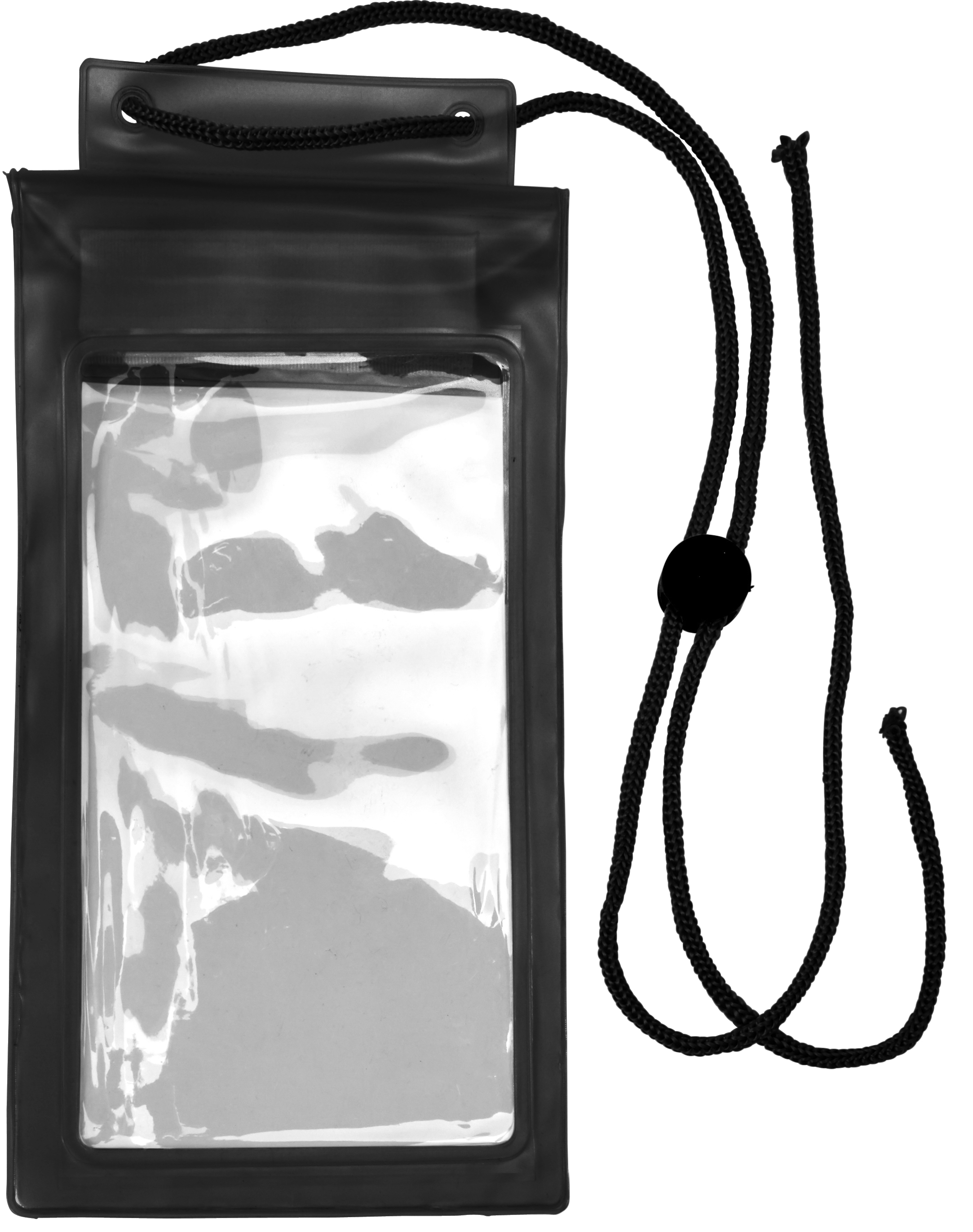 Plastic waterproof protective pouch for mobile devices, with closure strip. Including cord (with safety closure) approximately 46 cm long. You can operate the screen print of your phone as normal thanks to the special material of the cover.