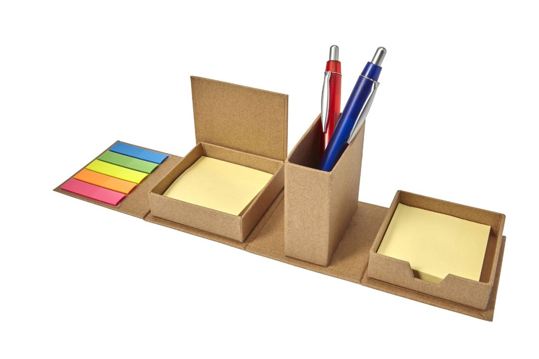 Cardboard cube with lid. Folds out to reveal small sticky notes in 5 different colours twenty five sheet each and 2 pockets with larger sticky notes with 80 sheets each. When open, the inside compartment can be used as a pen holder.