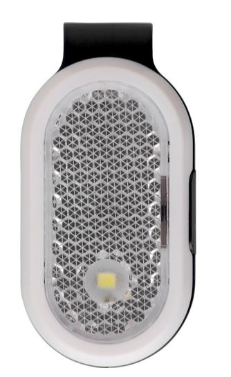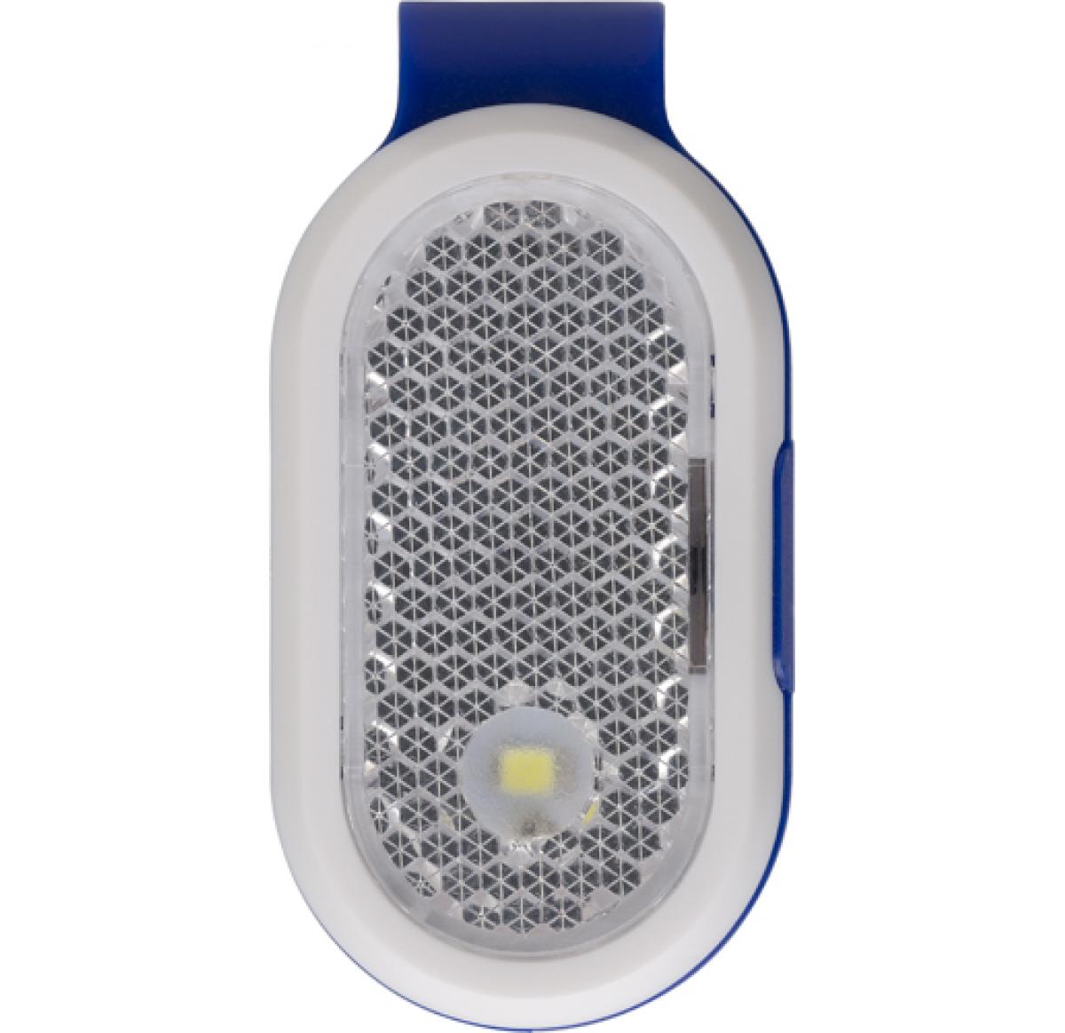 ABS reflector light with clip on the backside. The light has two settings: constant white light and blinking red light. Batteries included.