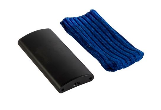 Aluminium 18.000 mAH power bank, with hand warmer function, in polyester sock. The hand warmer has two settings: standard (lasting 5-6 hours), and super warm (lasting 2-3 hours). Temp: 40-50°. Including USB/Micro USB cable.
