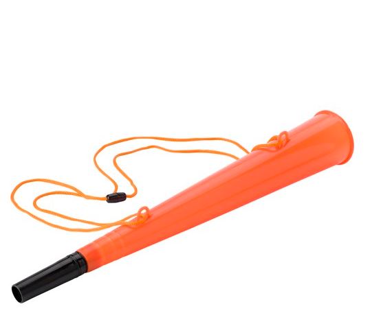 PP plastic stadium horn, including a cord with safety clasp. Cord length: 100 cm.
