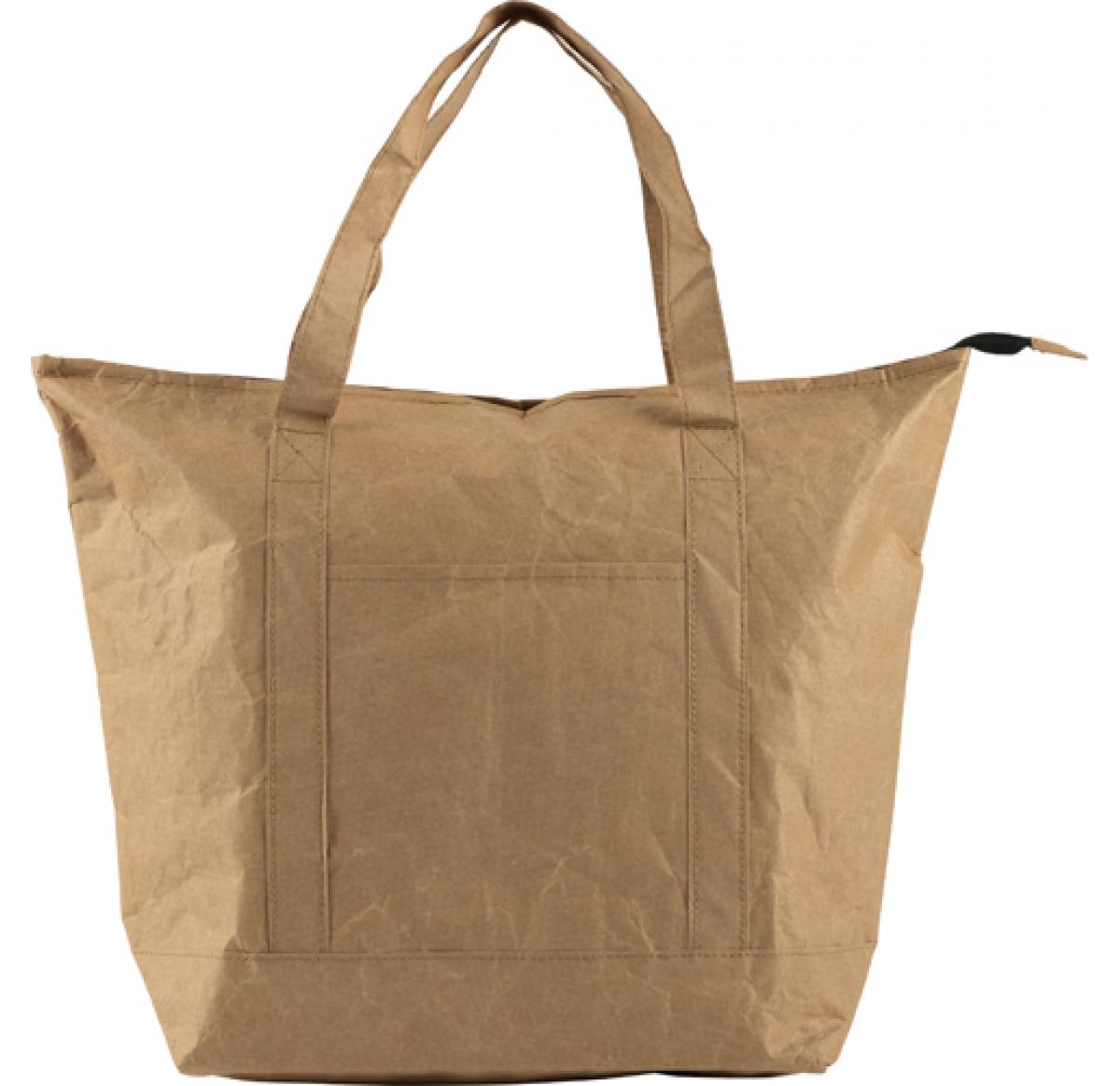 Laminated paper shopping bag with silver coloured foil interior to serve as cooling bag. The main compartment has a zipper and the bag has a pouch on one side. Size of the pouch: 16,8 x 15,6 cm. Total size: 33,3 x 42,2 x 14 cm.