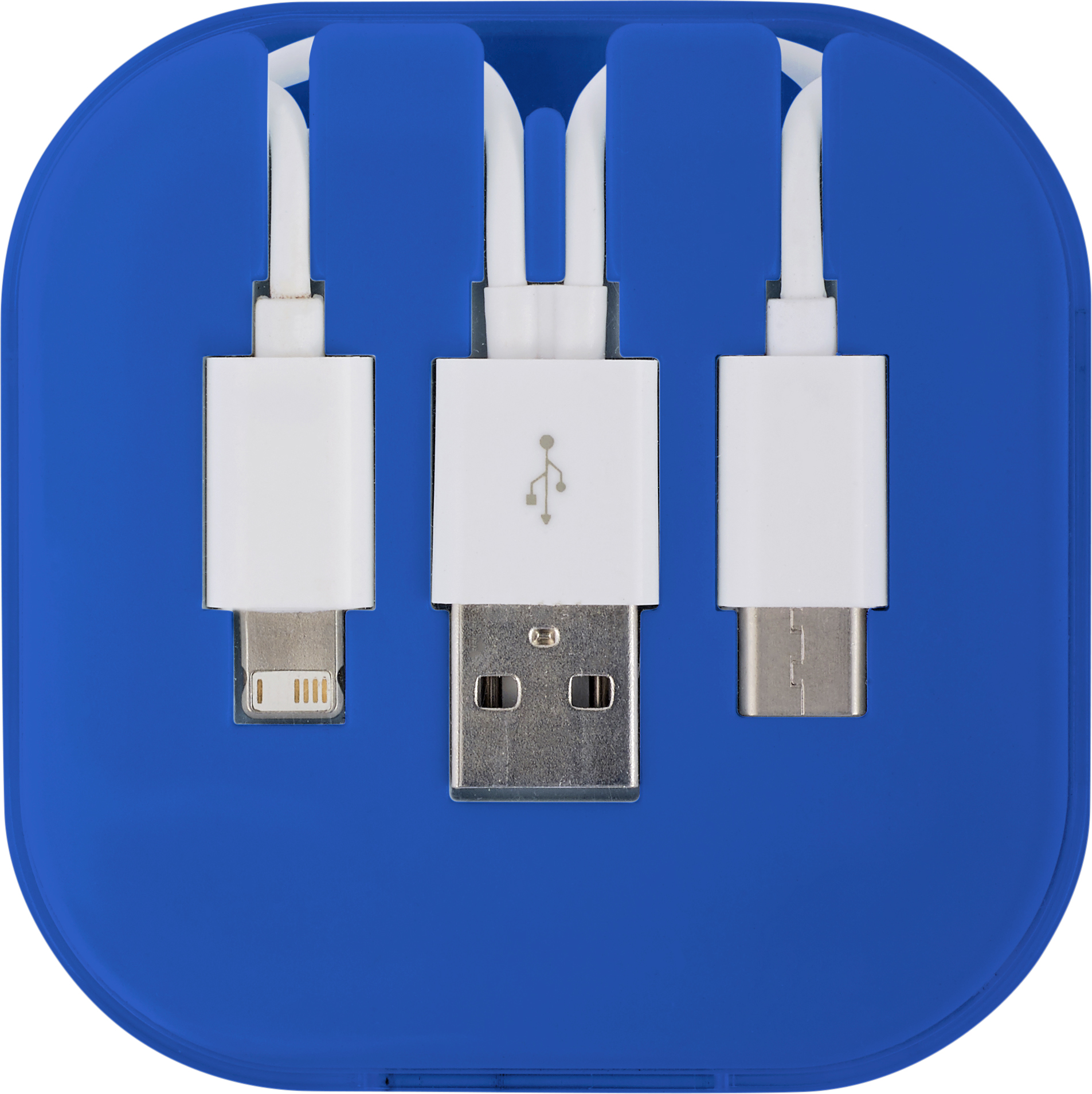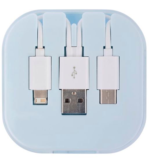 USB charging cable set in plastic case. Includes a mobile phone standard. The cable has a USB, USC-C and micro USB connector. The micro USB connector can be flipped to use as Lightning connector. Length of the cable: approx. 24 cm.