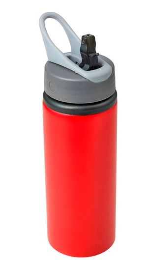 Aluminium drinking bottle (750 ml) with plastic cap. The cap has a foldable drinking spout and the bottle has a straw on the inside.