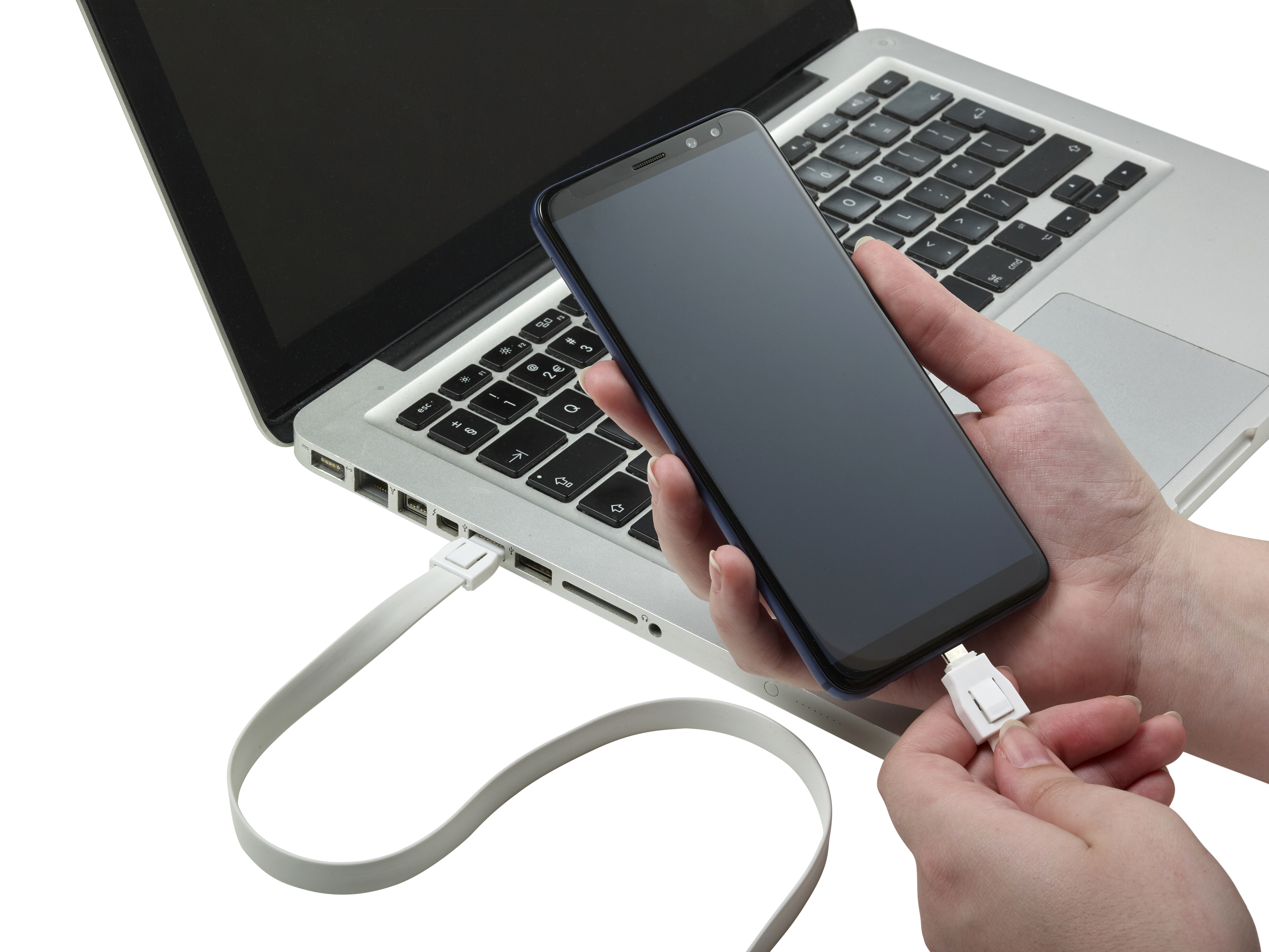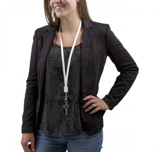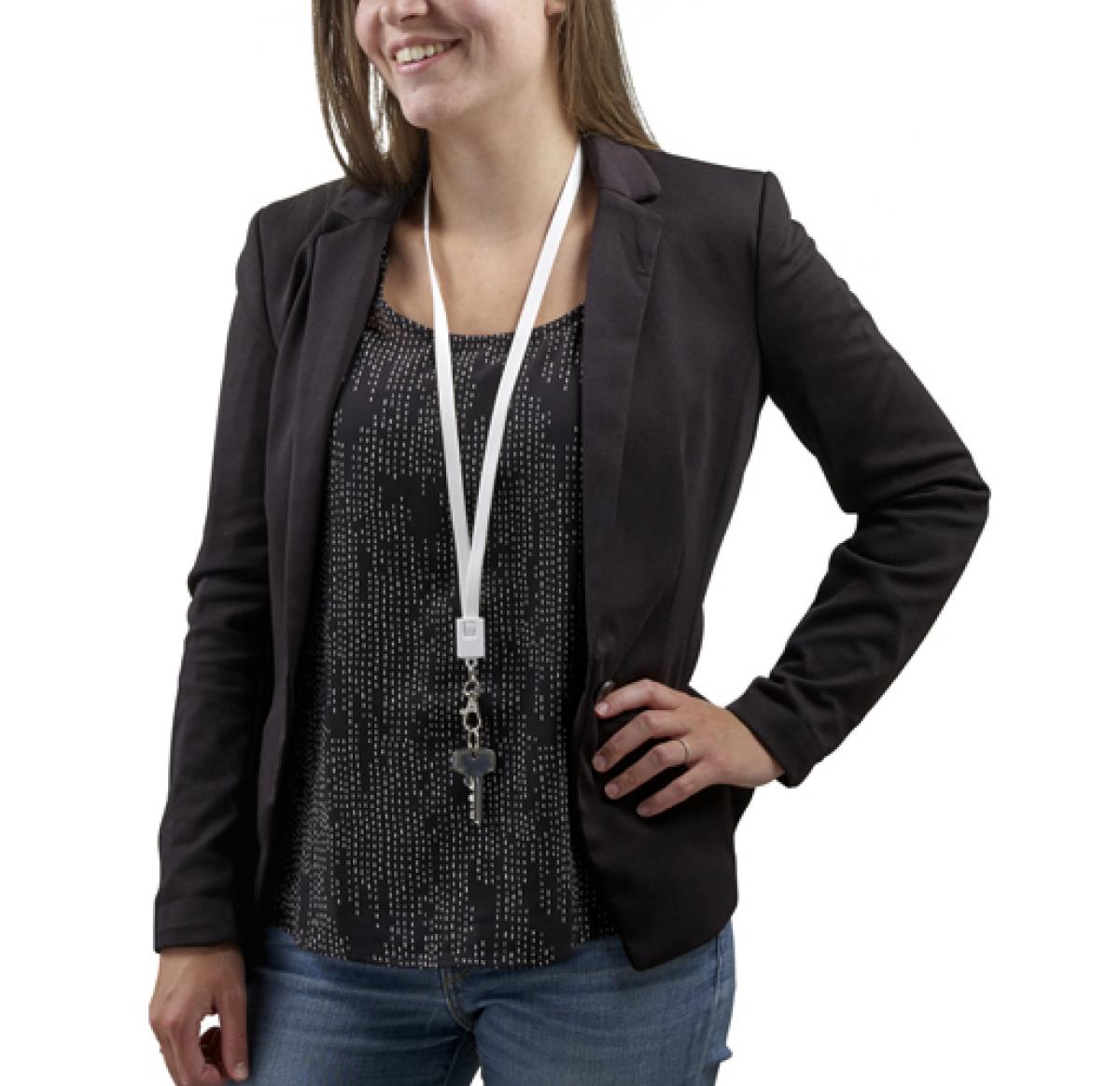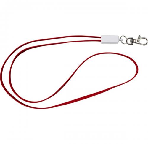 TPE lanyard and charging cable in one. The length of the cable is approximately 90 cm, with a USB and micro USB connection. The micro USB plug doubles as a lightning connector when flipped around. The square closure has a metal carabiner hook.