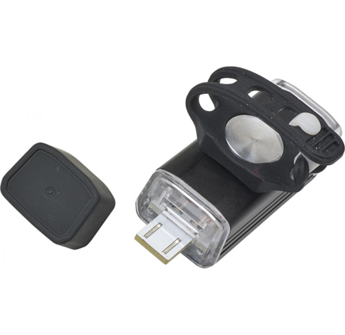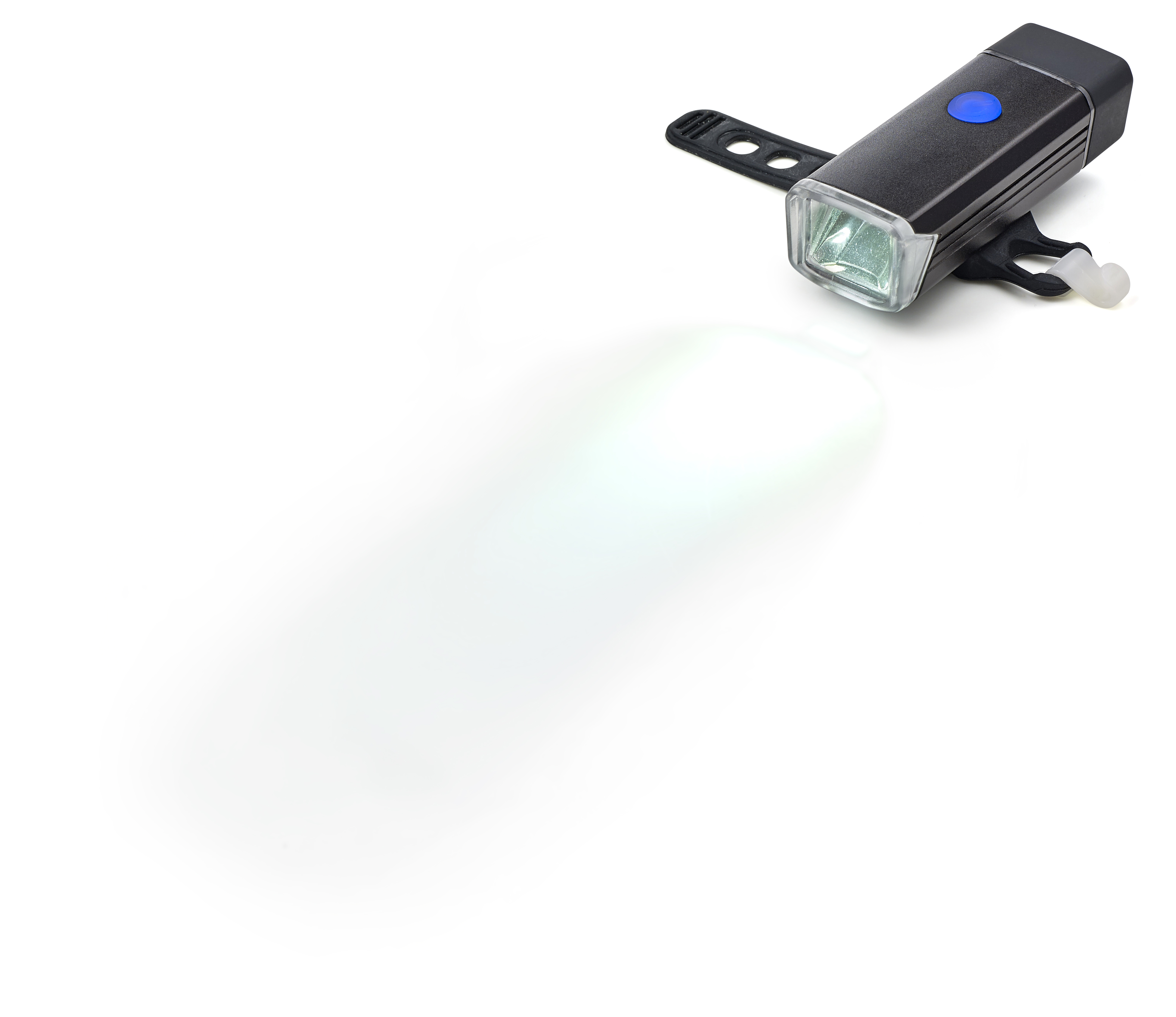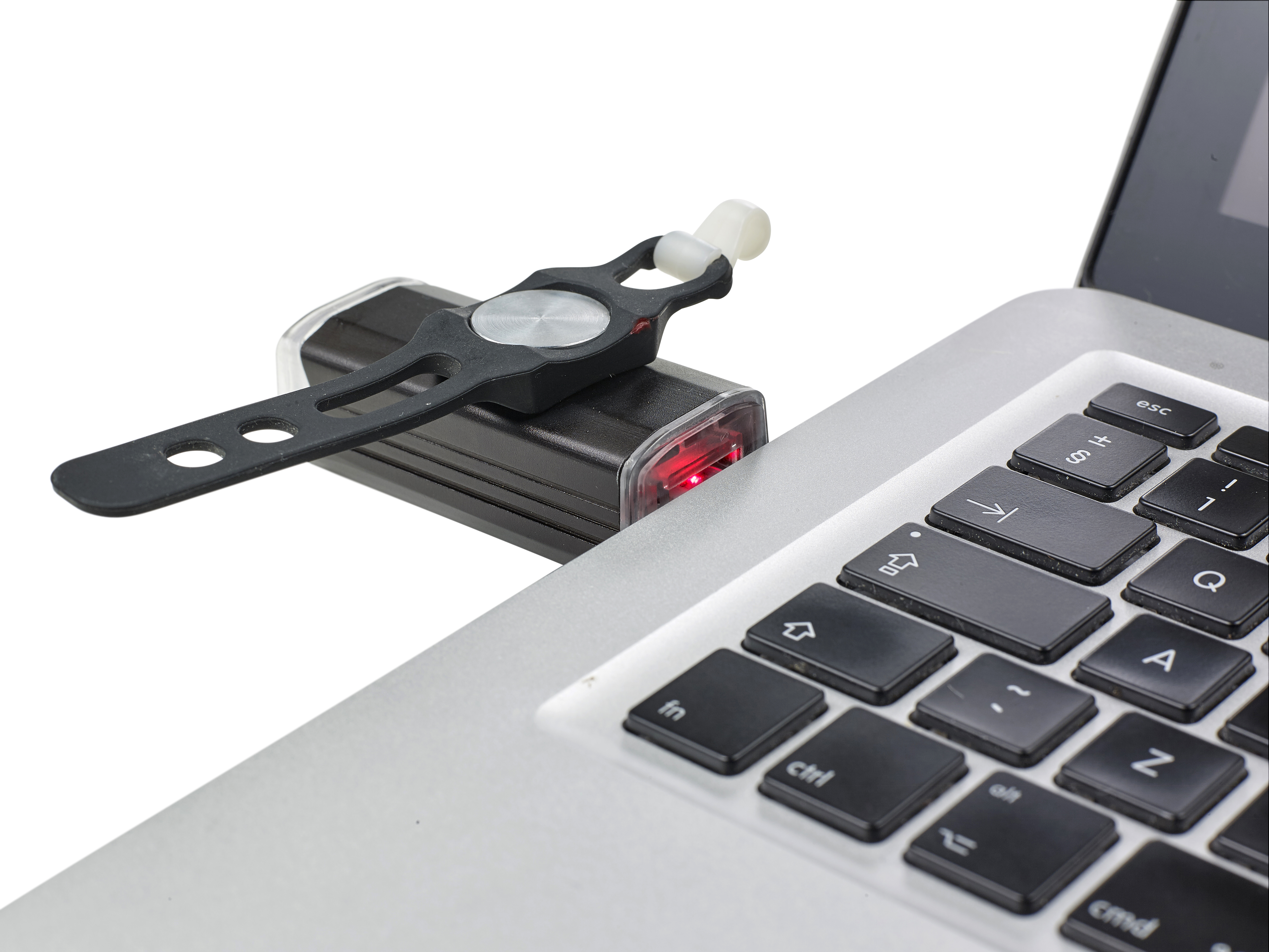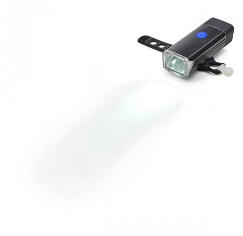 USB-charged COB bicycle light. With 4 settings: steady, dimmed, rapid blinking and slow blinking. Switched on and off with a push button at the top. The light has a magnet and small strap to affix the light to the steering wheel.