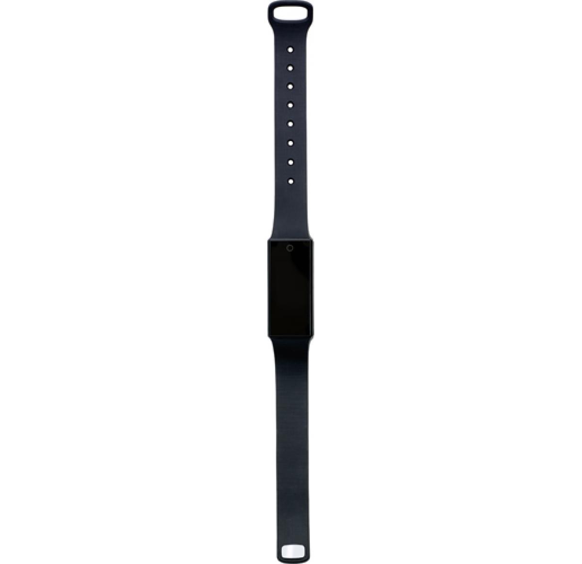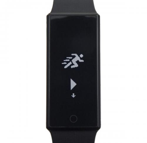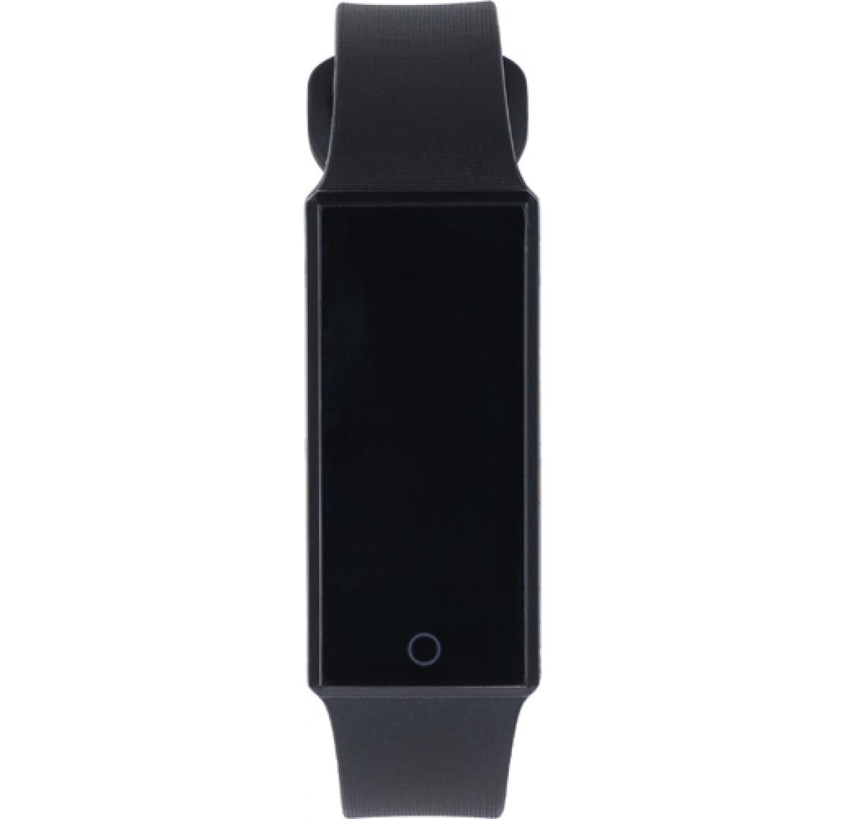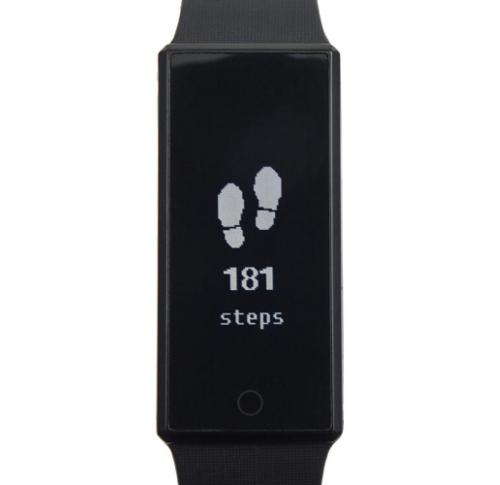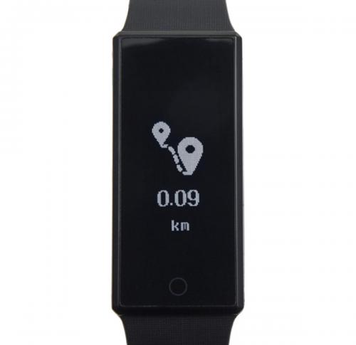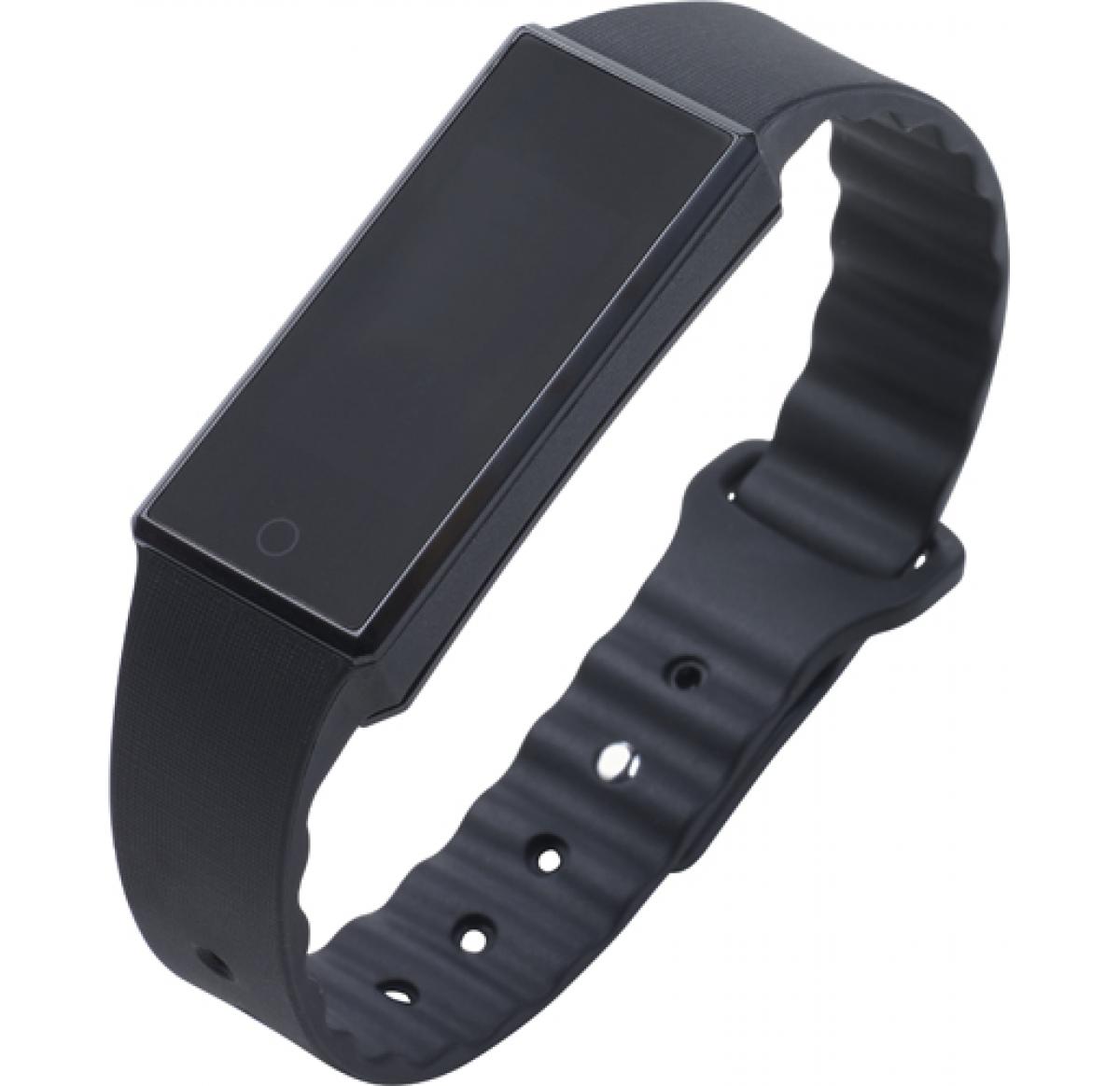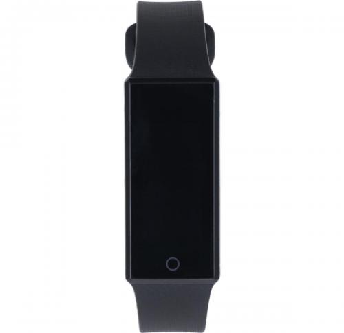 Stainless steel smartwatch with silicone strap and metal engraving plate. Displays time, counts steps & calories and tracks distance, heartrate, sleep. Size 250 x 19 x 8,5 mm. Screen resolution 128 x 64. Packaged in a white box.