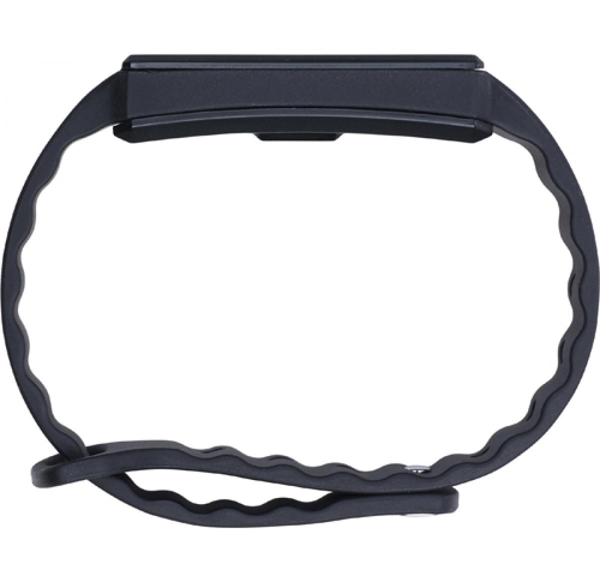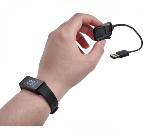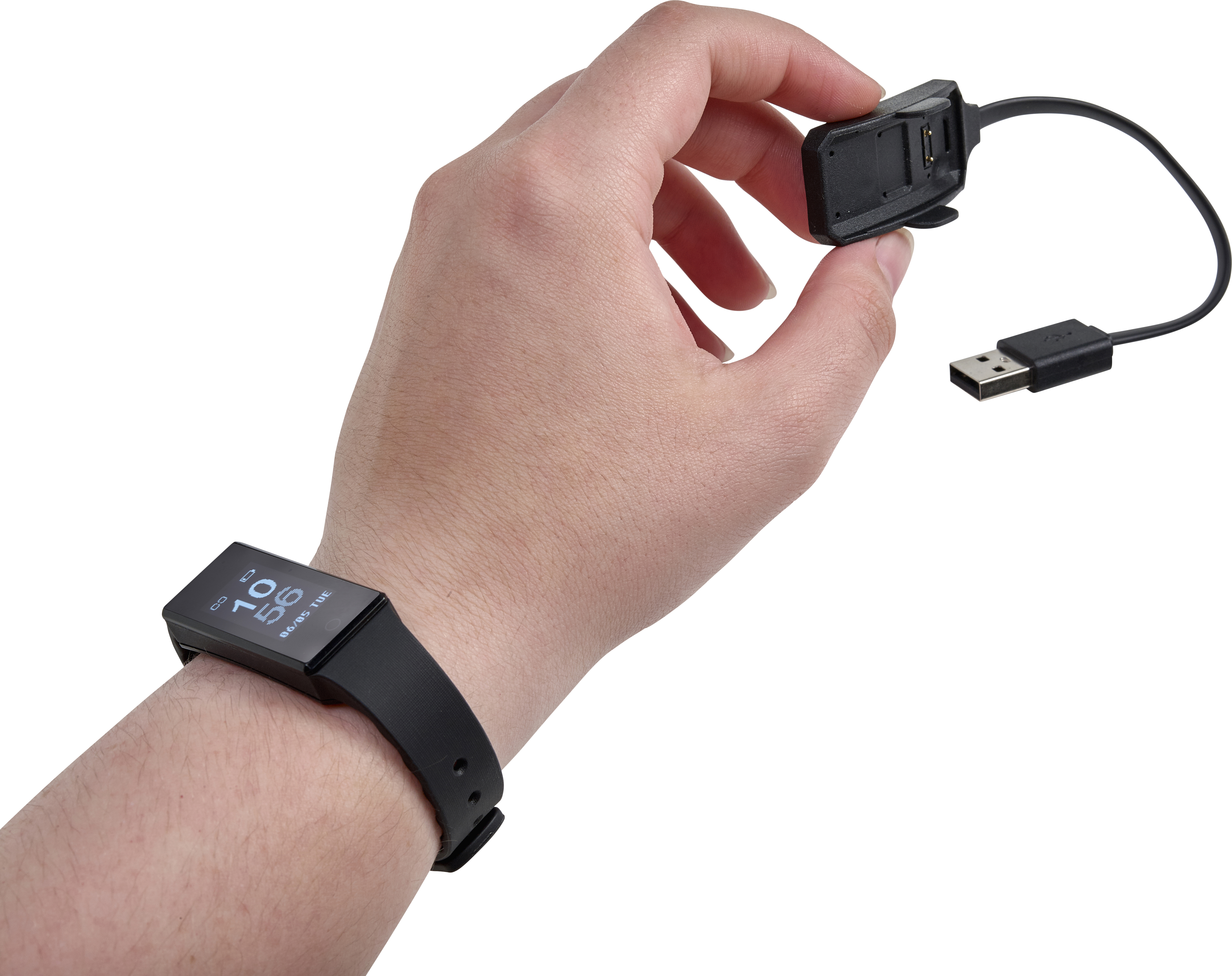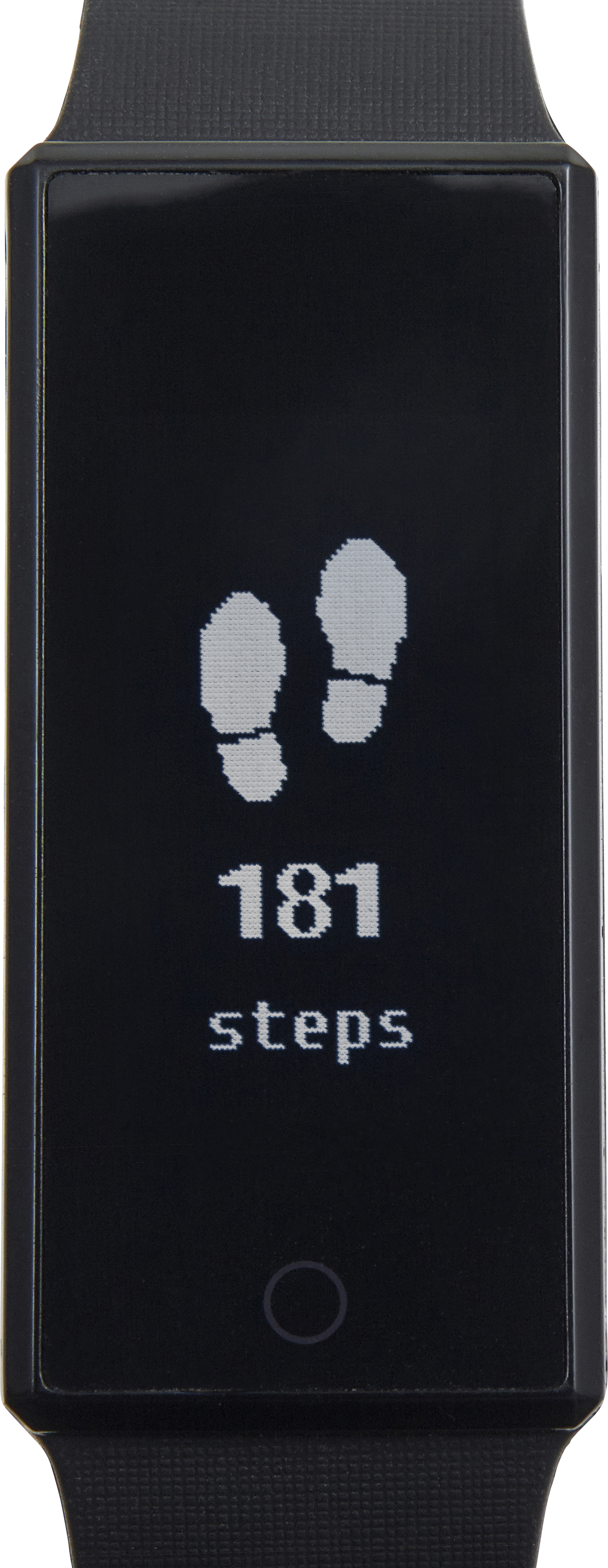 Stainless steel smartwatch with silicone strap and metal engraving plate. Displays time, counts steps & calories and tracks distance, heartrate, sleep. Size 250 x 19 x 8,5 mm. Screen resolution 128 x 64. Packaged in a white box.
