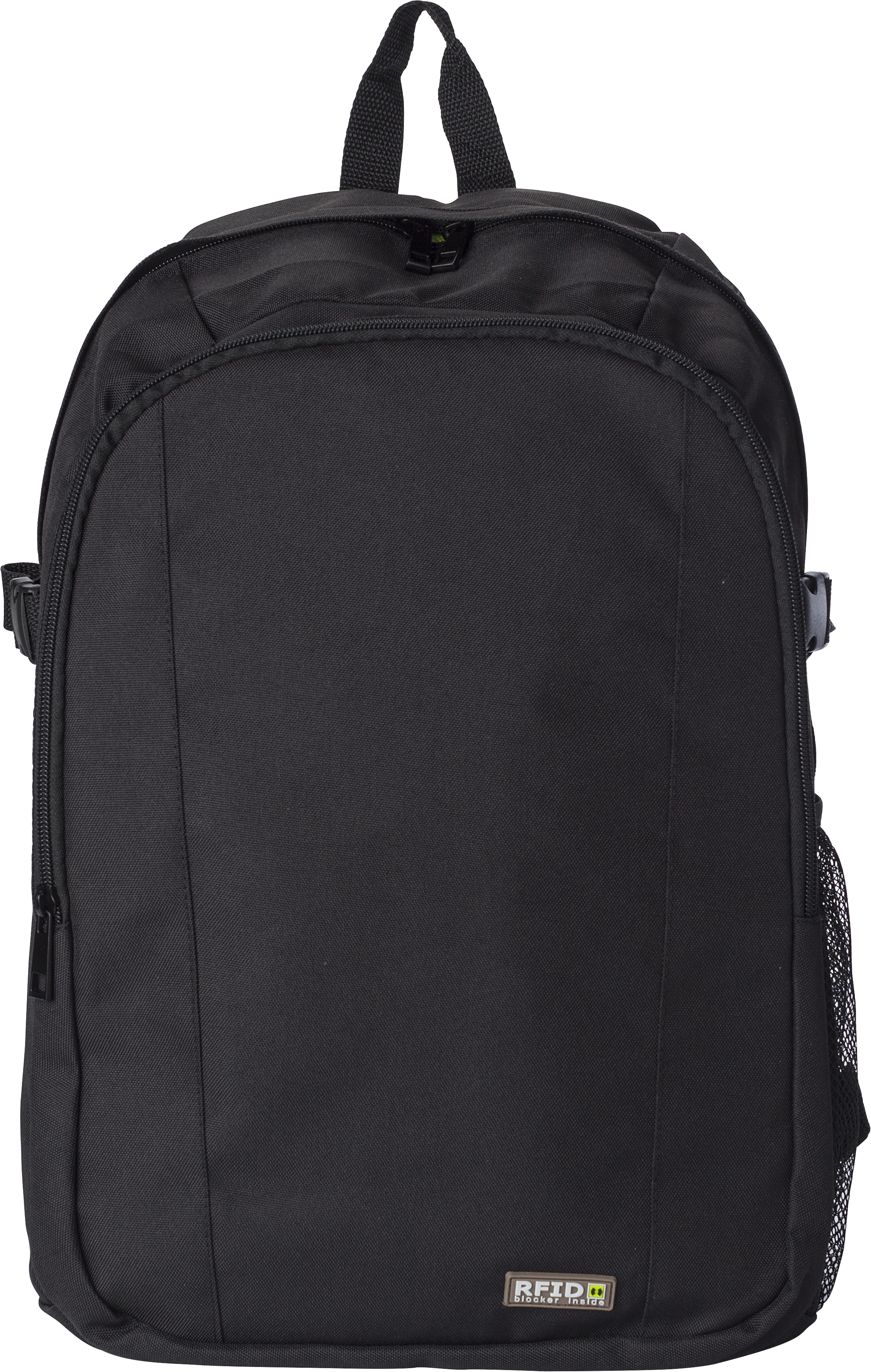 Polyester (600D) backpack with RFID blocker. The front pocket and main compartment have a zipper and several pockets in the interior, including a compartment for a laptop. Also has a mesh outer pocket at the side. The straps are padded and adjustable.