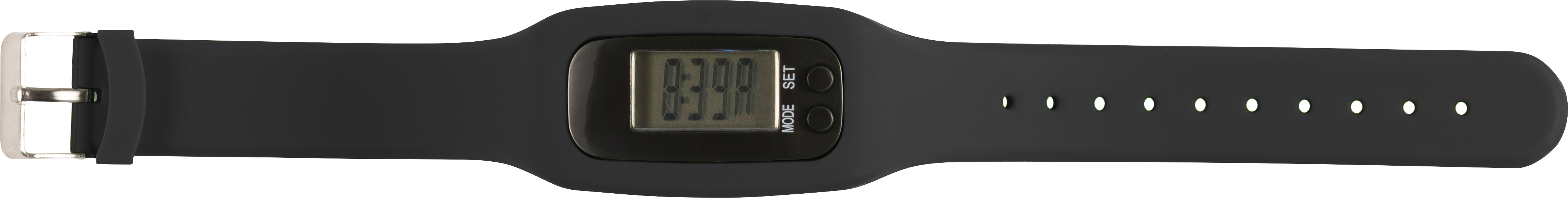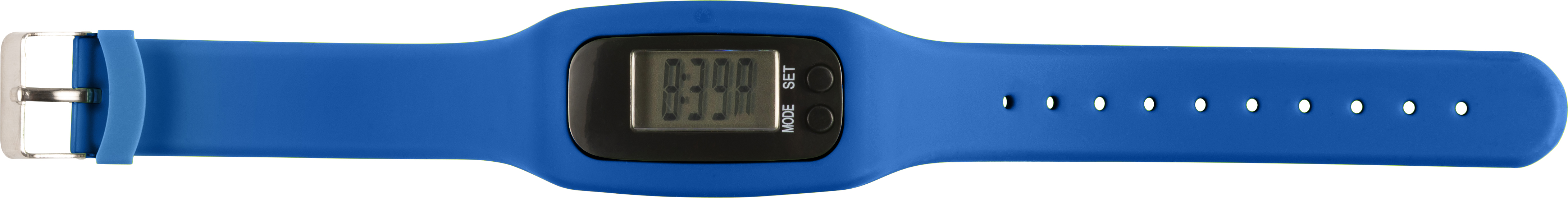 Pedometer with silicone wristband. Records steps (up to 99.999), calories and miles/km. Batteries included. DC:1.5V.