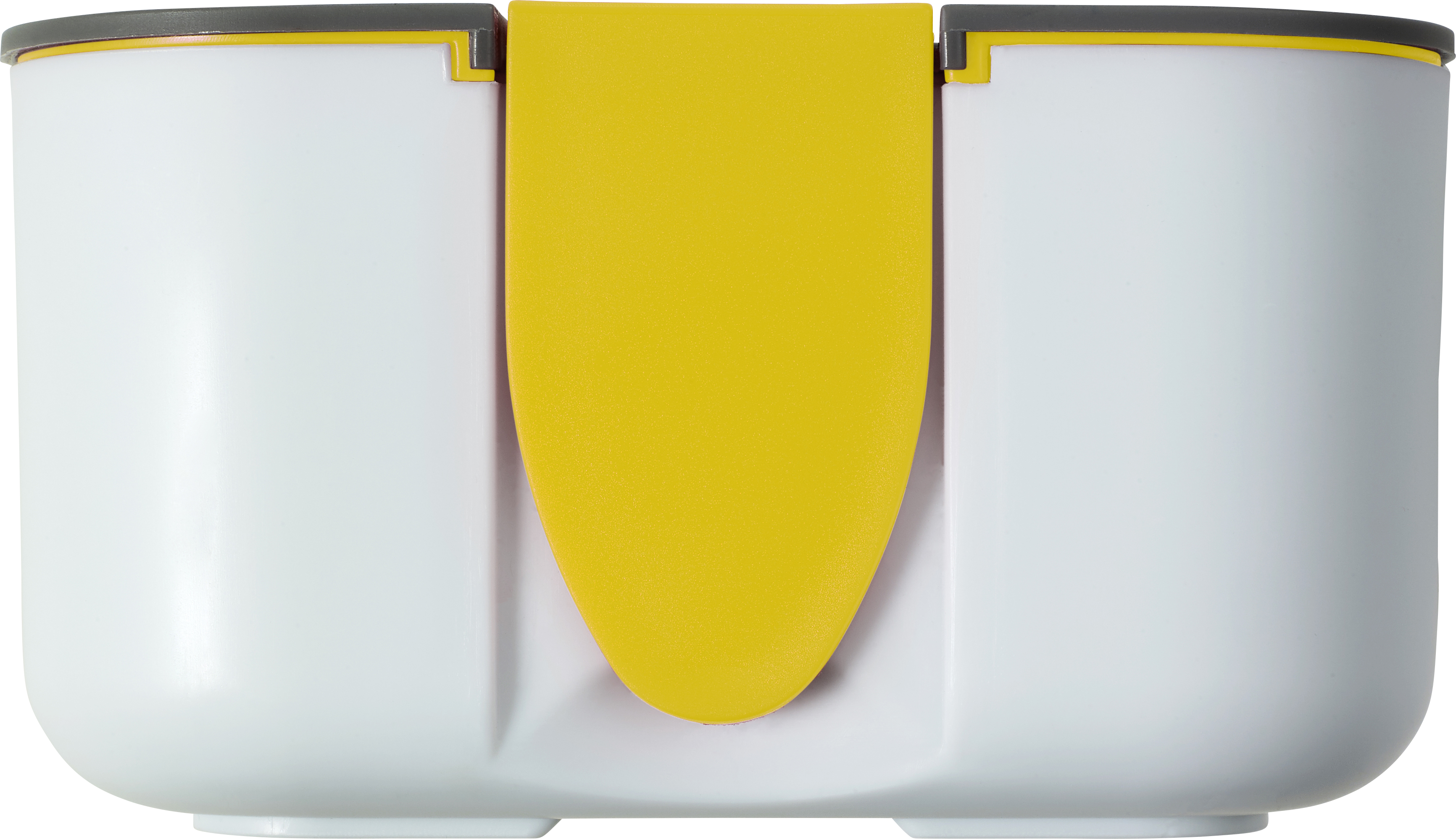 PP and silicone lunchbox with a capacity of 850 ml. The inside includes one separator. The closure on the lid doubles as a phone holder. Size: 19 x 12 x 7 cm.