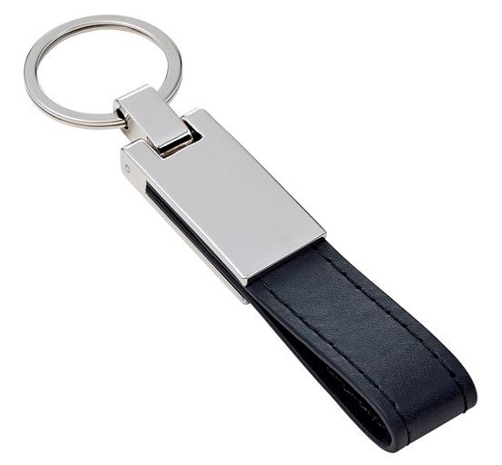 Silver plated steel key chain with PU loop. Presented in a black gift box.