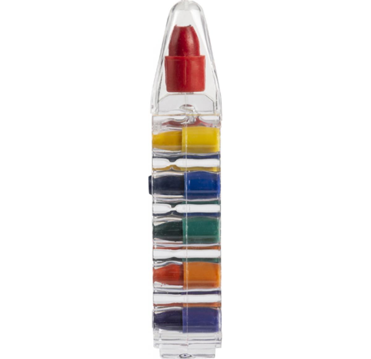 Set of six wax crayons in a transparent container.