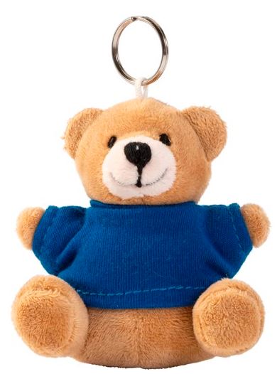 Key ring with plush teddy bear wearing a T-shirt, 100% cotton. Stitched eyes.