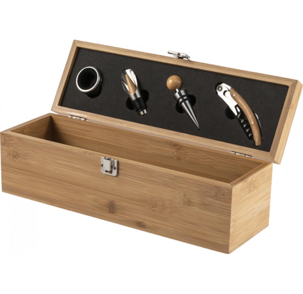 Wine giftset in bamboo box. The items are stainless steel with bamboo accents. The set includes: a wine bottle ring, pouring spout, cork and corkscrew.