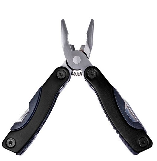 Compact stainless steel multifunctional tool which folds open into a pair of pliers. Several tools are folded into the handles: screwdrivers (flat-head and Philips), file, saw, knife, nutcracker, can opener and bottle opener.