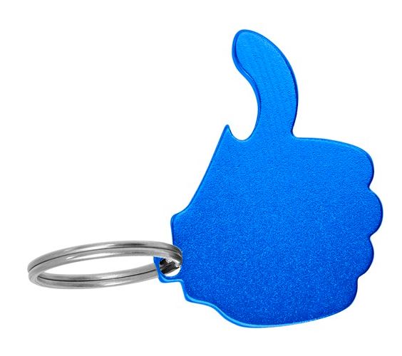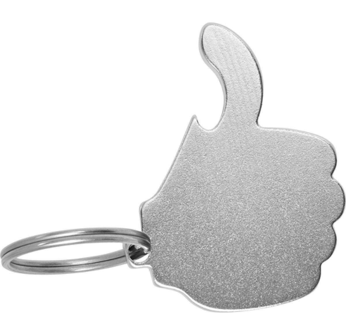 Aluminium key holder in the shape of a thumbs-up with a steel key ring. Including bottle opener.