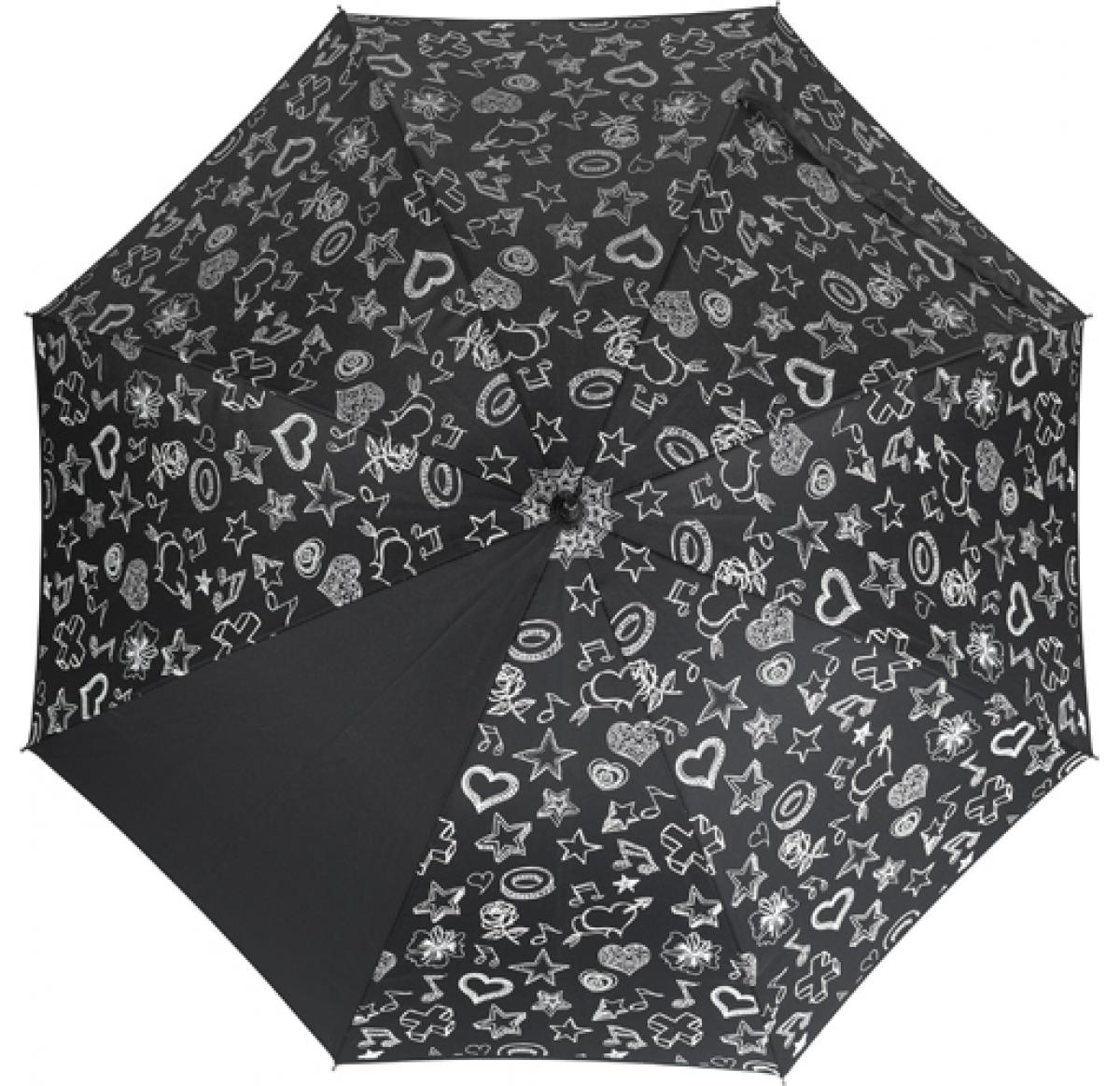 Automatic pongee (190T) umbrella with eight panels. Metal shaft and frame, fibreglass ribs and plastic handle. A push button above the handle opens the umbrella automatically. The white figures change colour when the material gets wet.