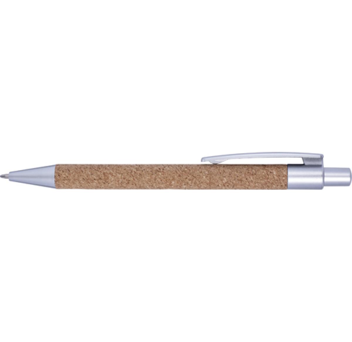 Ballpen with cork holder and plastic tip, clip and top with push button. Blue ink.