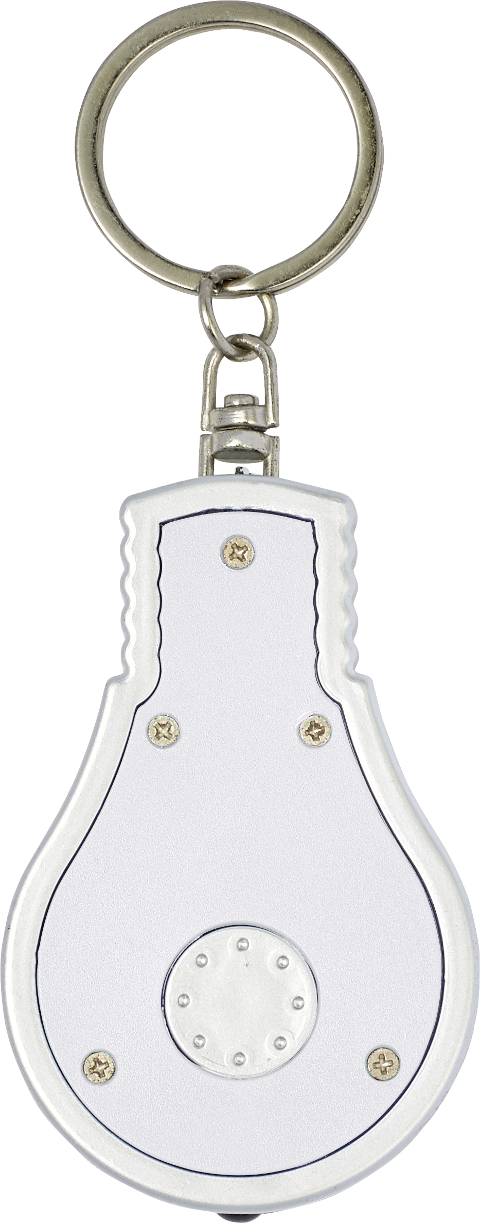 ABS bulb-shaped key holder with steel key ring. A push button switches on the light. Batteries included.