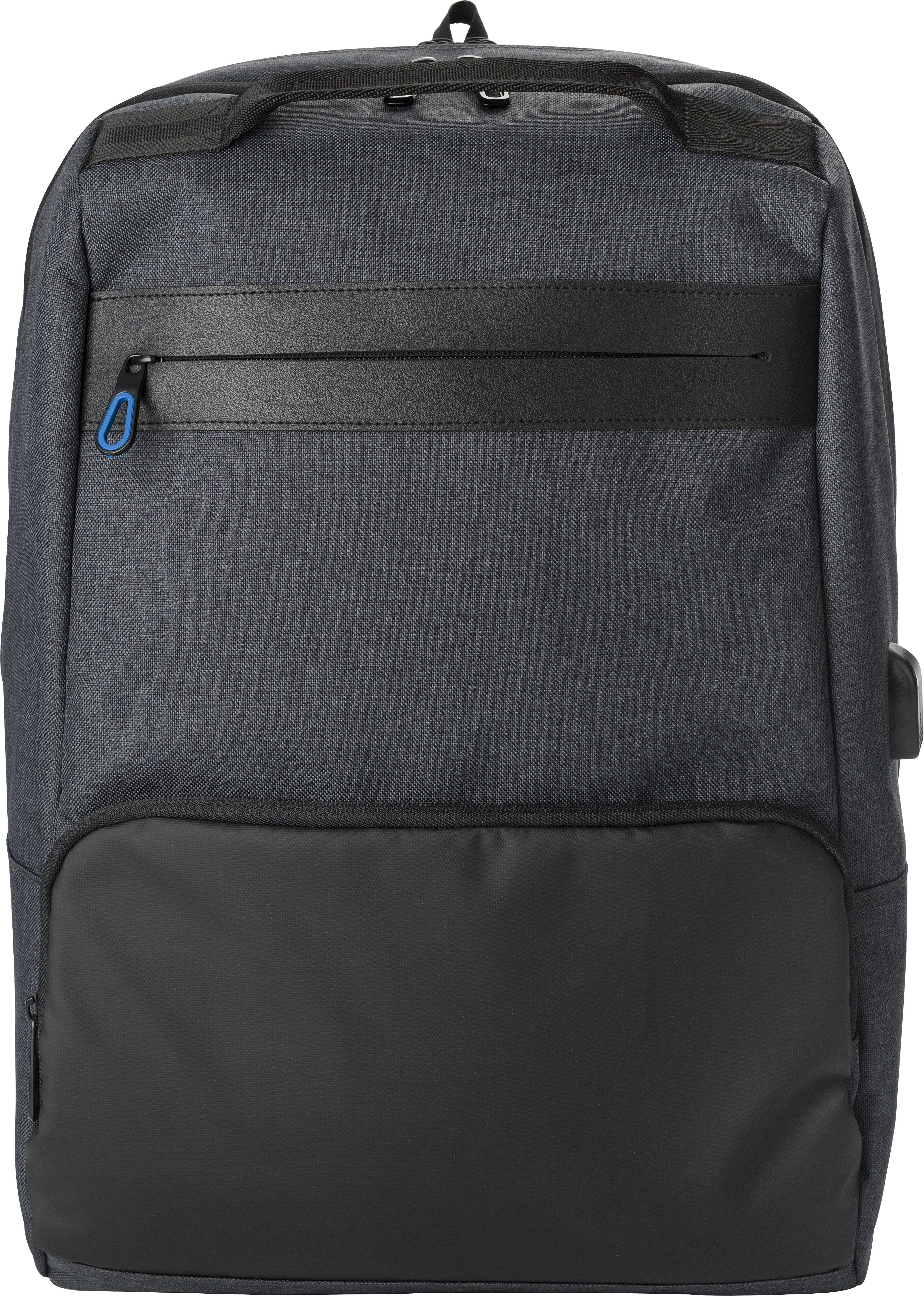 PVC backpack with two main compartments, one suitable for a laptop. The backpack has an anti-theft back pocket and two zippered pockets in the front. With padded, adjustable shoulder straps.