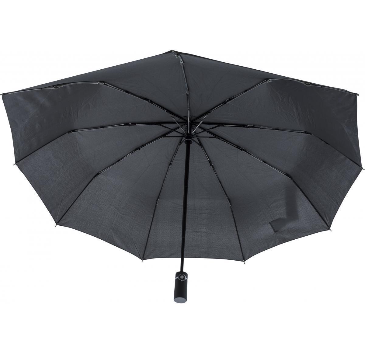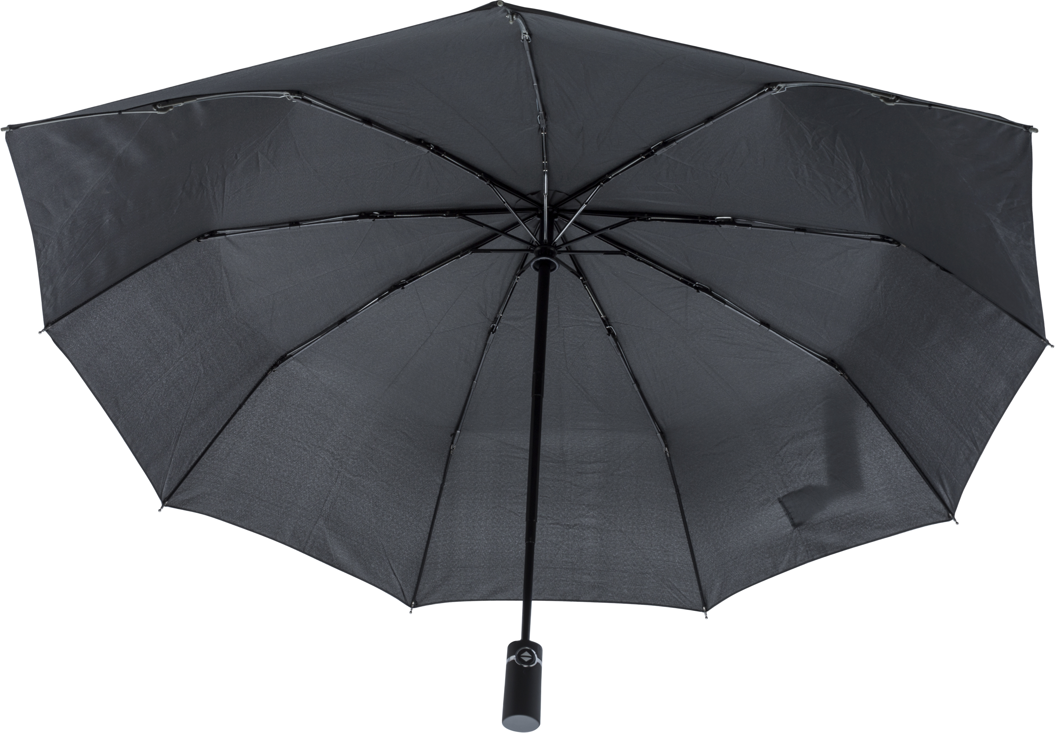 Pongee (190T) automatic open and close umbrella with eight panels. The back of the umbrella is extended to keep a backpack dry. Metal shaft, fibreglass ribs, plastic handle. The umbrella is windproof.