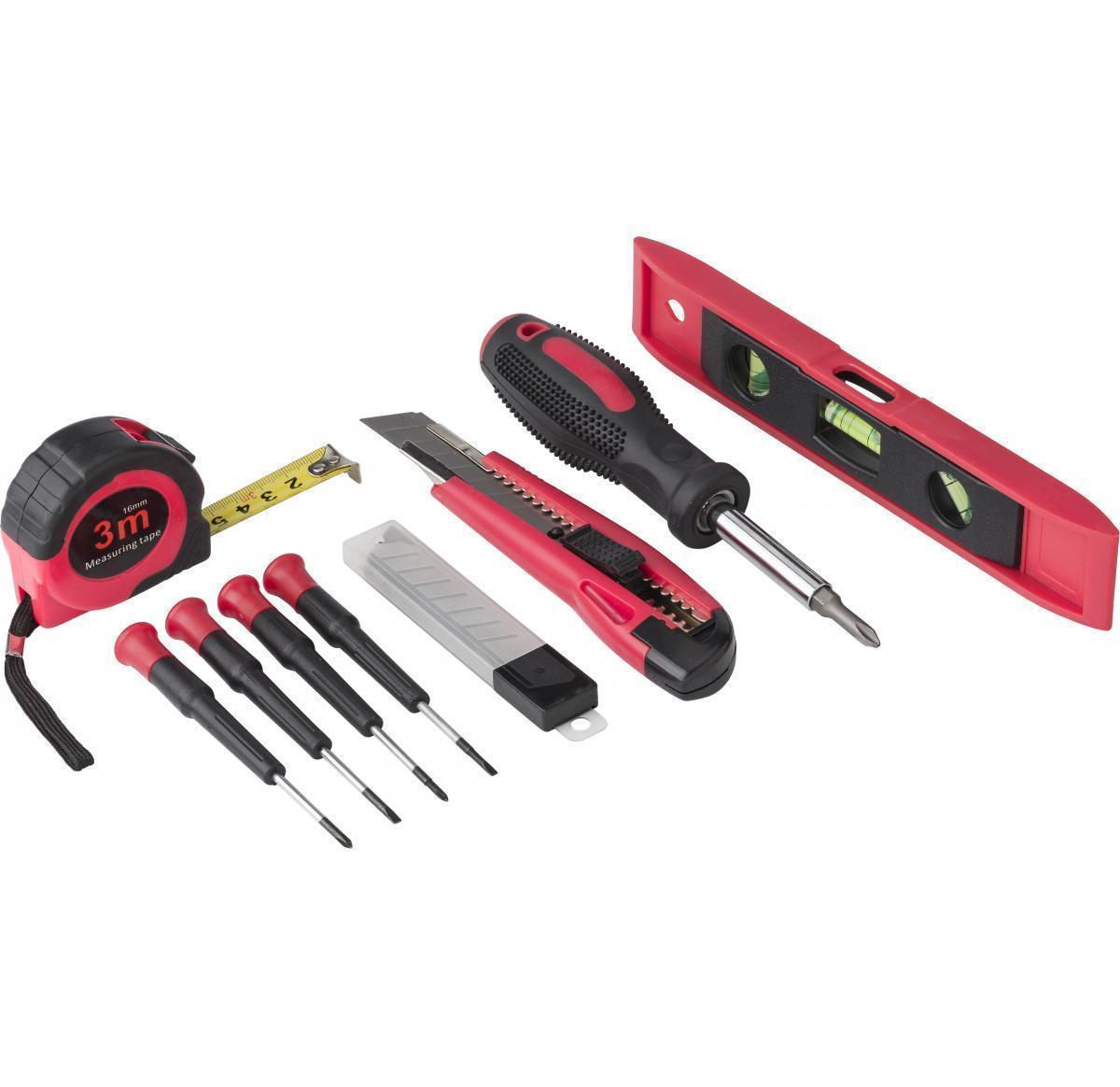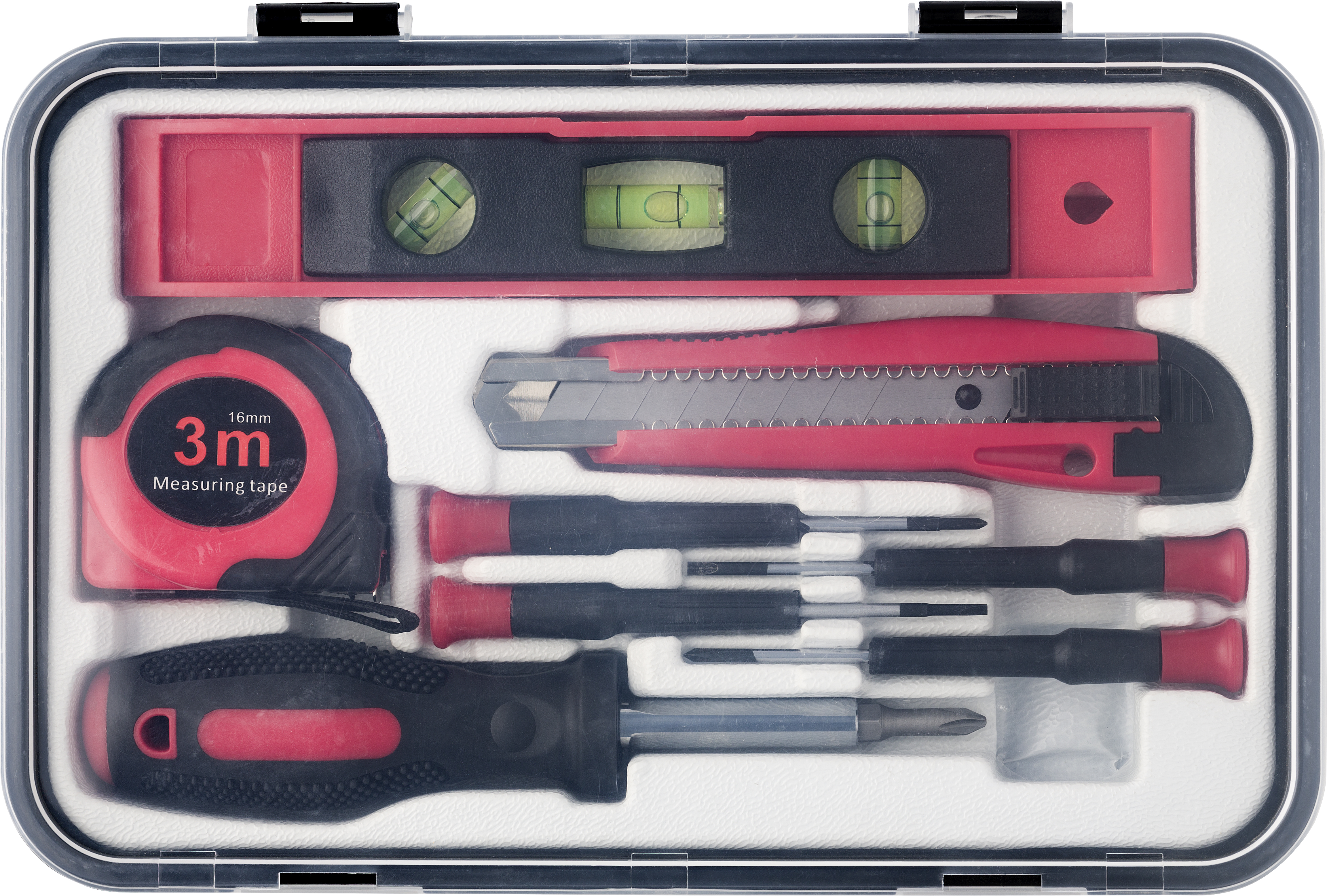 ABS and steel tool kit, including eight tools: measuring tape (3m long), large crosshead screwdriver, four small screwdrivers (two crossheads and two flatheads), box cutter and level.