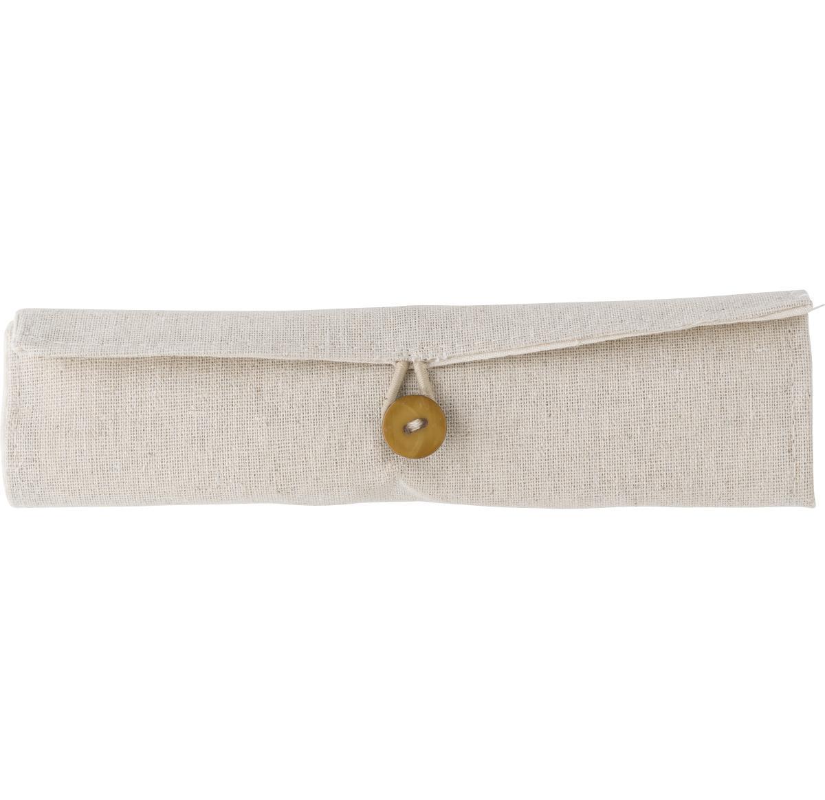 Cotton roll-up pouch with drawing set including: bamboo ruler, wooden pencil sharpener, eraser, pencil and ballpen with blue ink.
