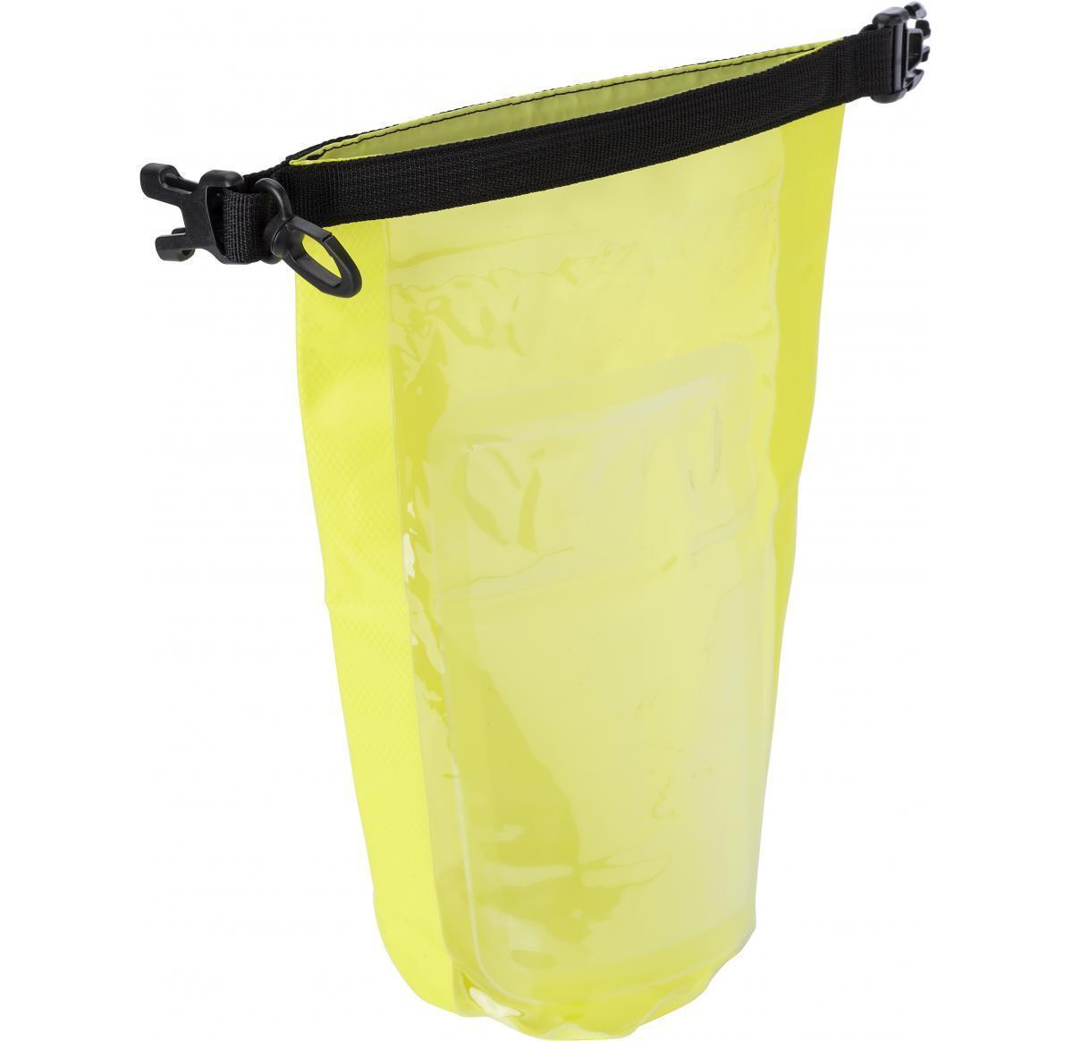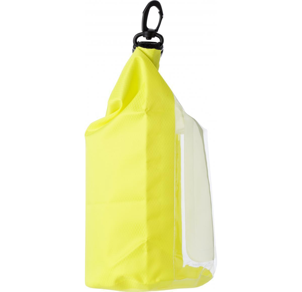 Polyester (210T) watertight bag with PVC phone pouch and plastic closure.