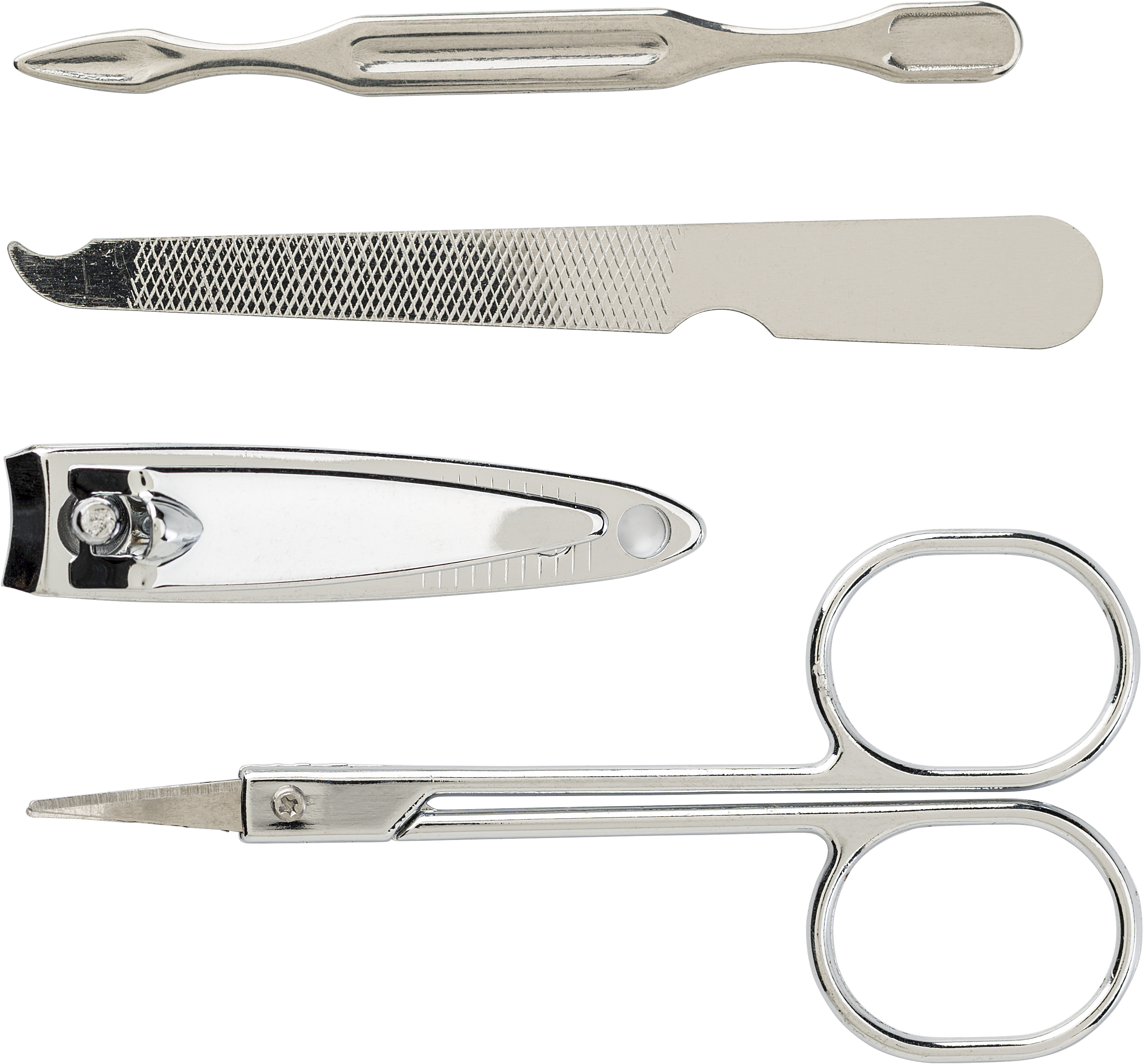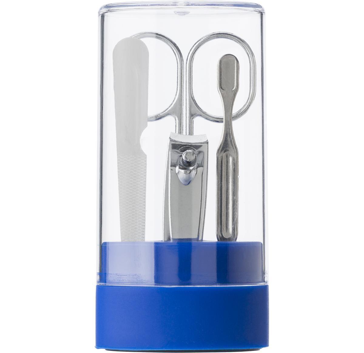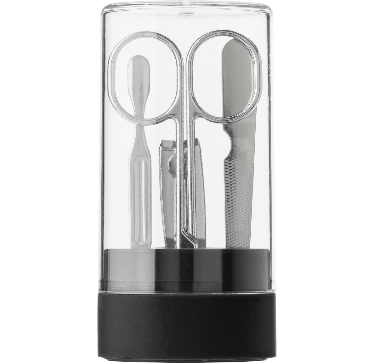 ABS and PS container with metal manicure set, including: scissors, nail file, nail clippers, and a cuticle pusher.