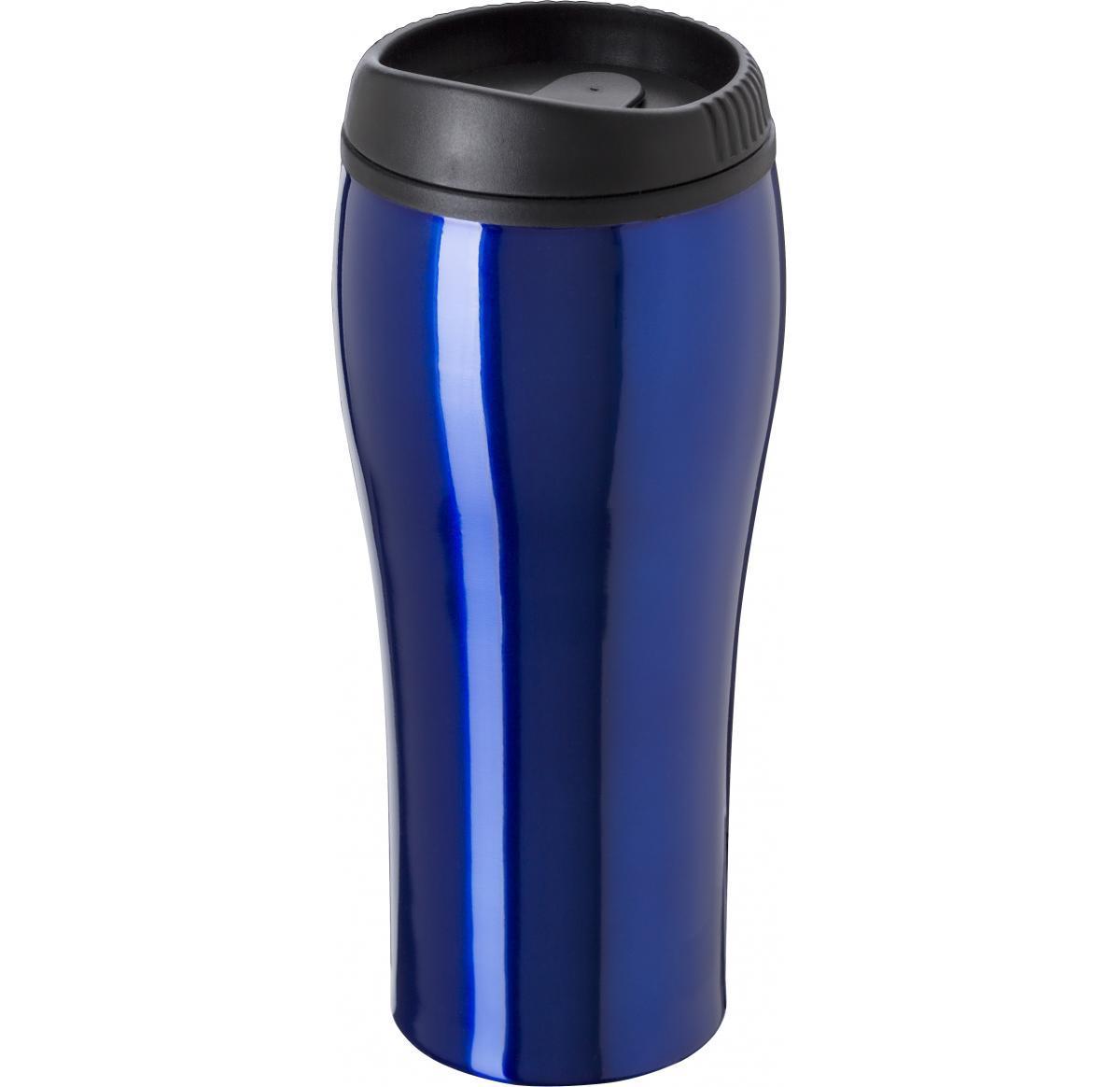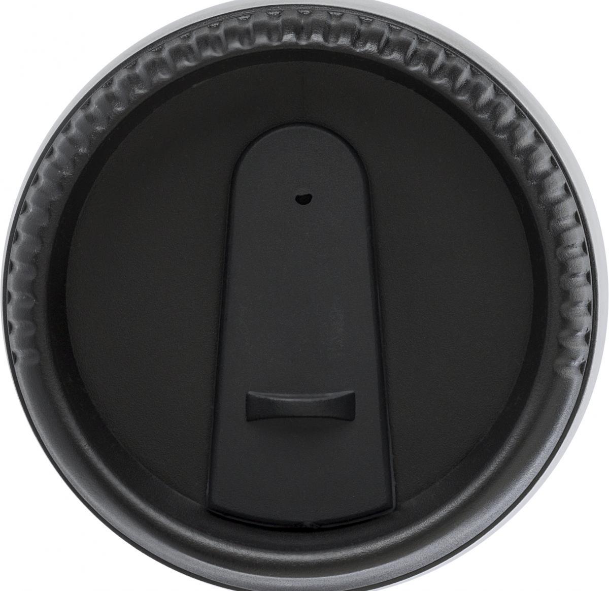 Stainless steel drinking mug (450 ml) with PPT interior and lid. The lib has a drinking opening that closes with a sliding valve.