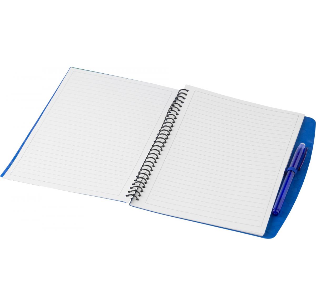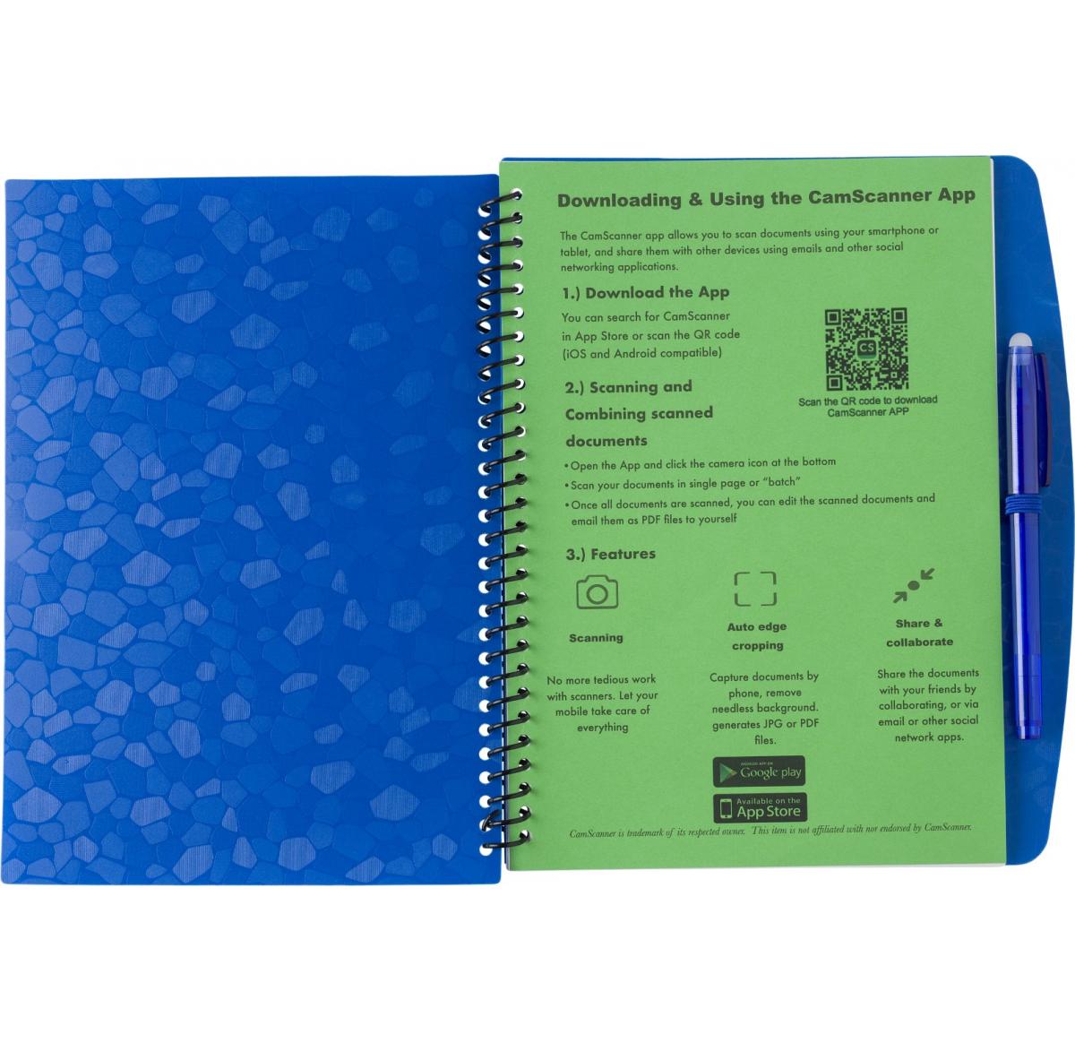 PP, wire bound notebook (approximately A5) with 30 pages, scan app, including pen. Blue ink.