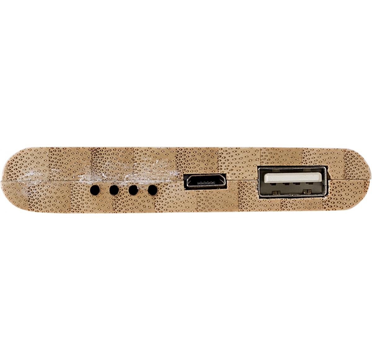 Bamboo power bank with a capacity of 4.000 mAh. Input DC5V/1A, output DC5V/1A, 3.7 V li-polymer battery. Two USB ports. Including LED indicators. Including charging cable (USB – USB-C).