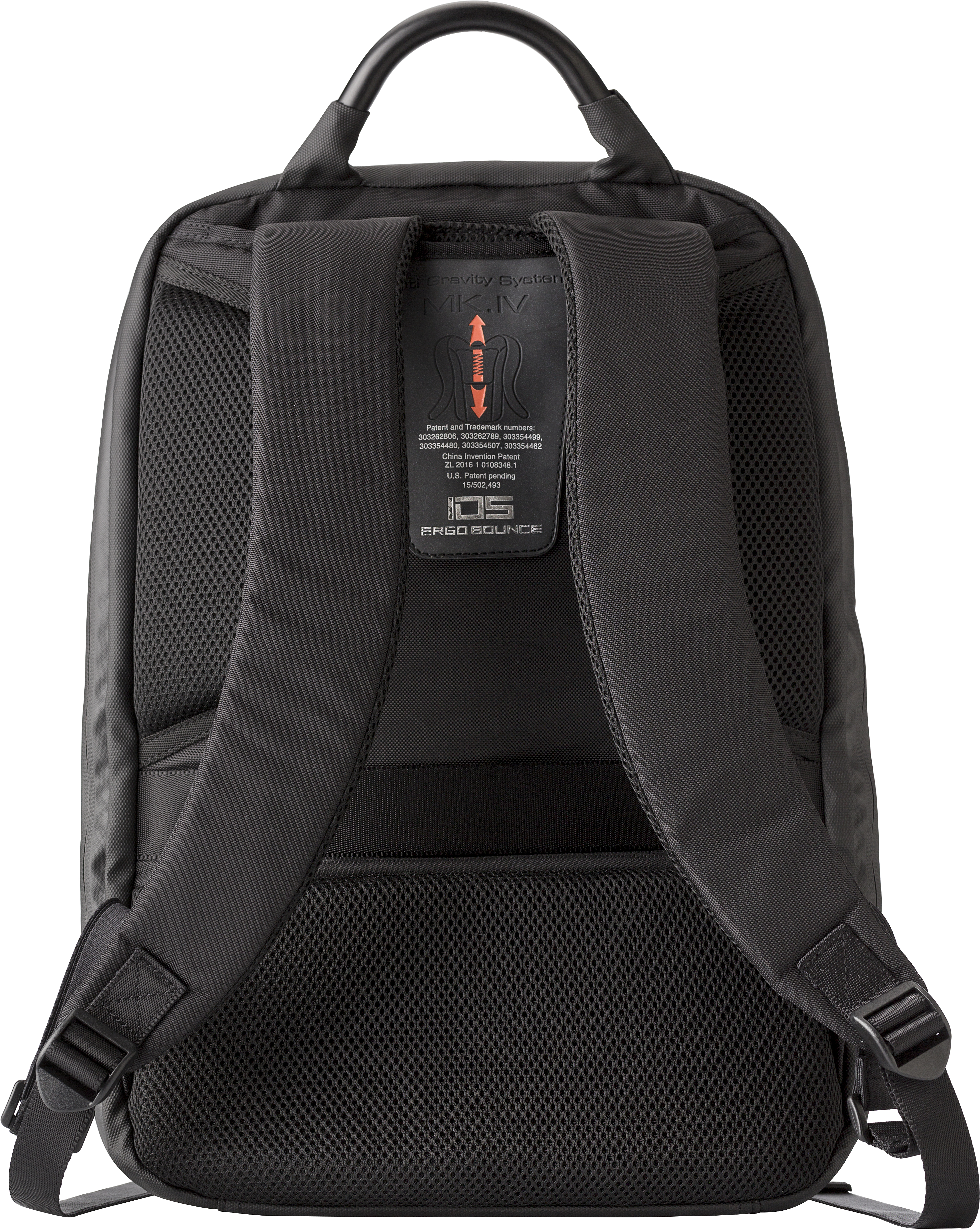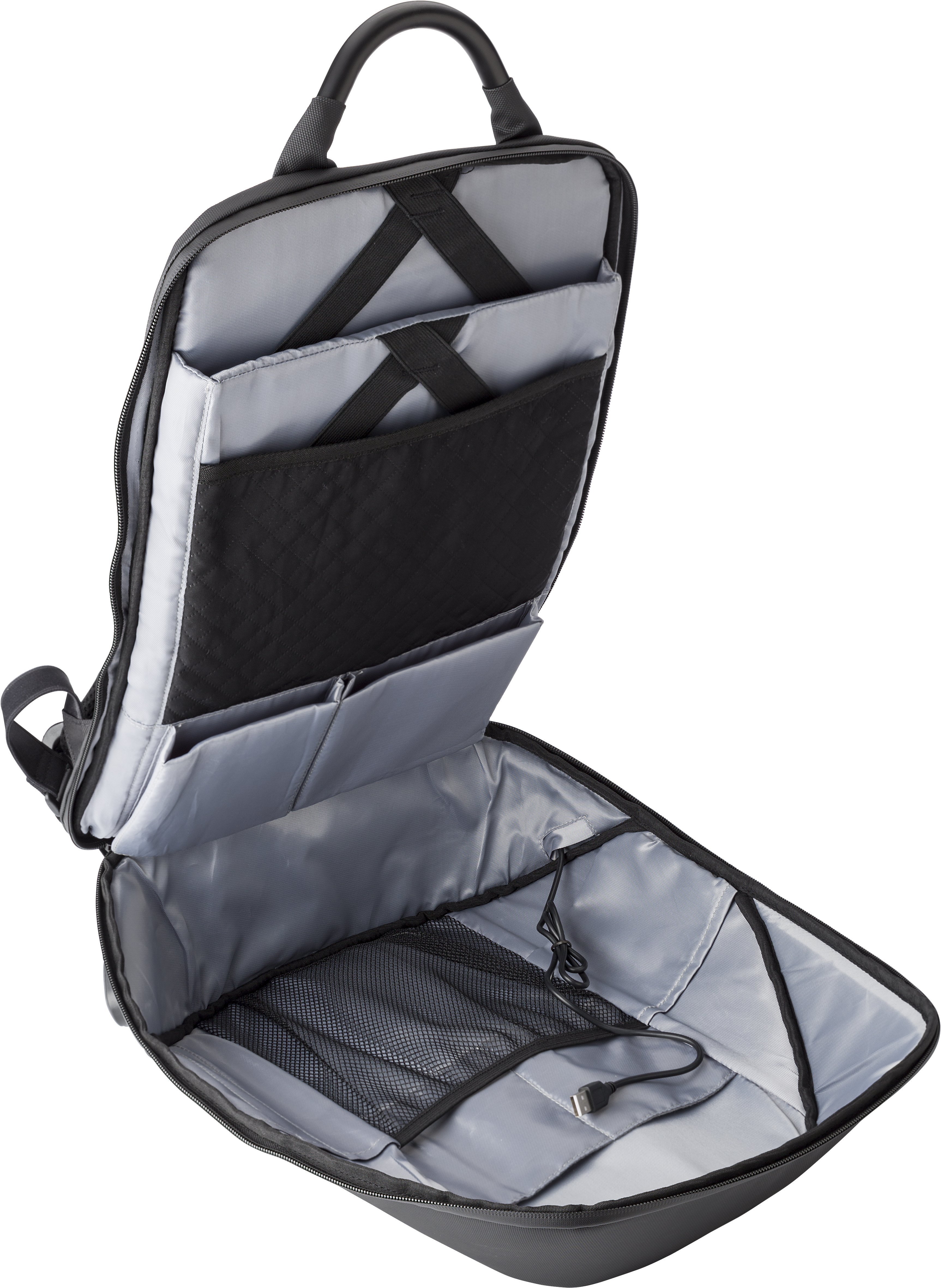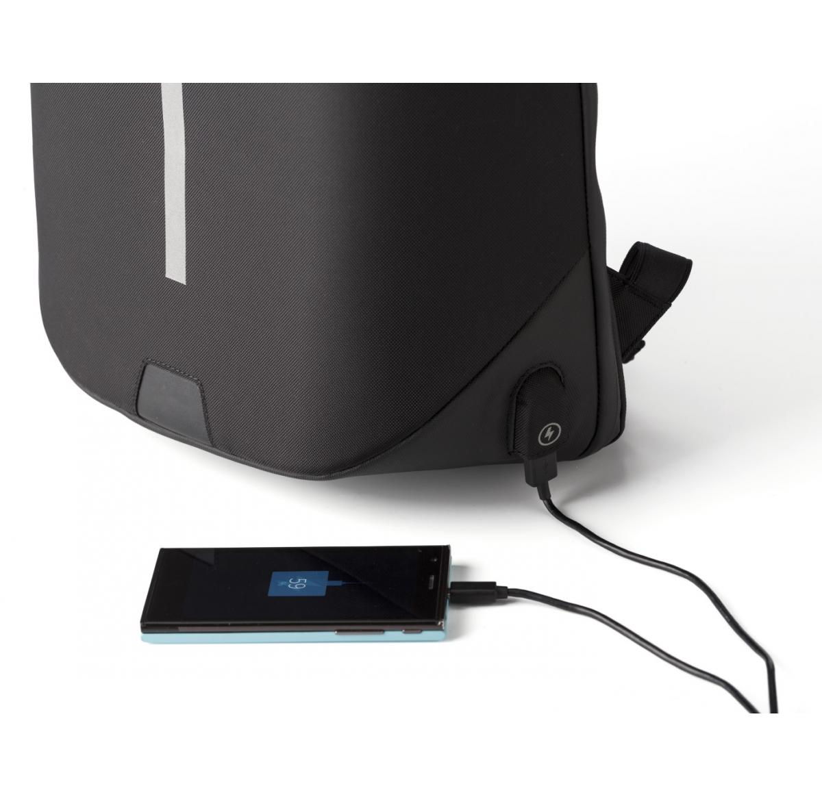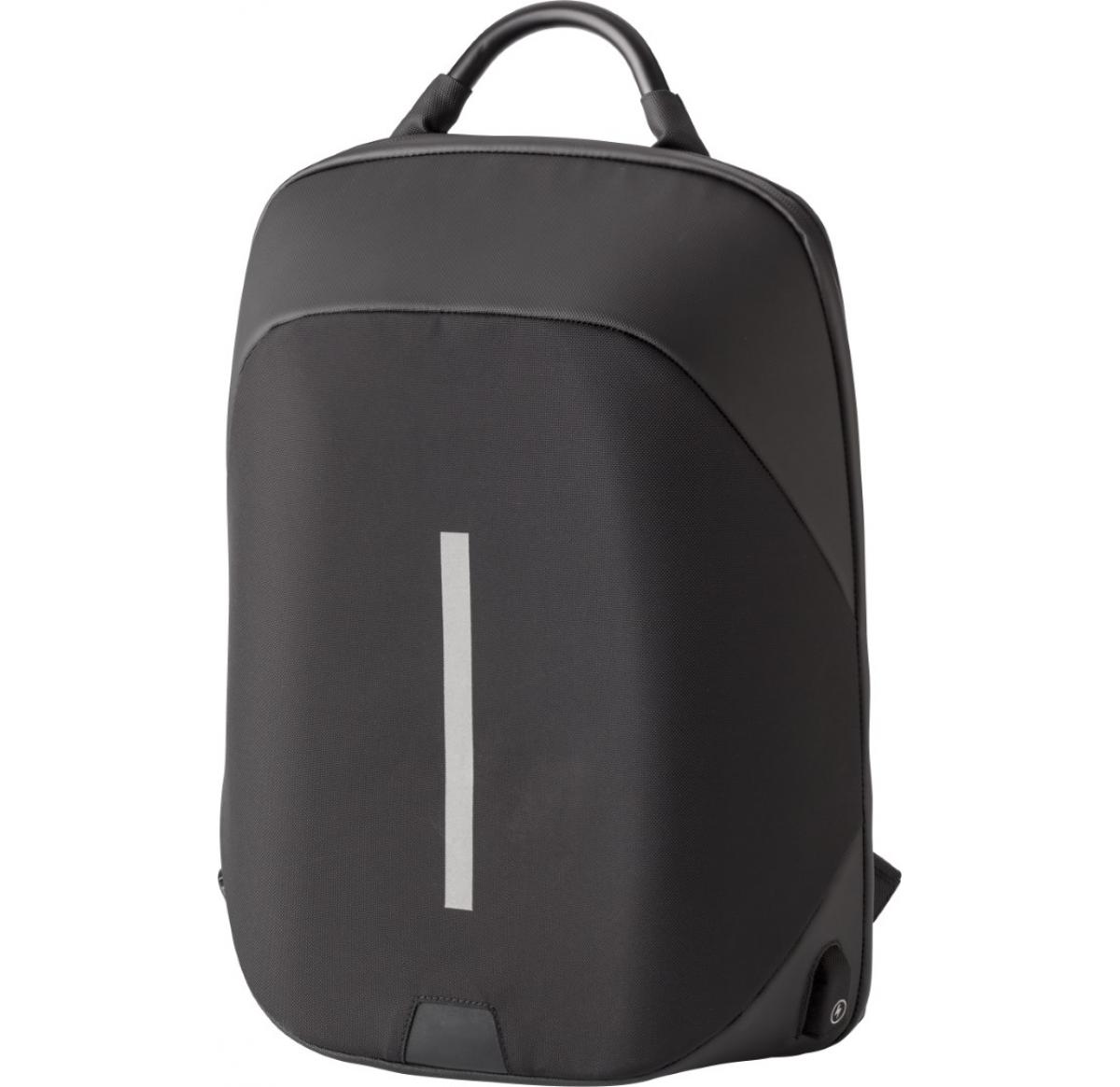 Nylon (1200D) backpack with interior pockets, including padded (15 inch) laptop compartment. Padded back and padded and adjustable shoulder straps. Three digital combination lock, USB port ad cable, reflective stripe and metal handle.