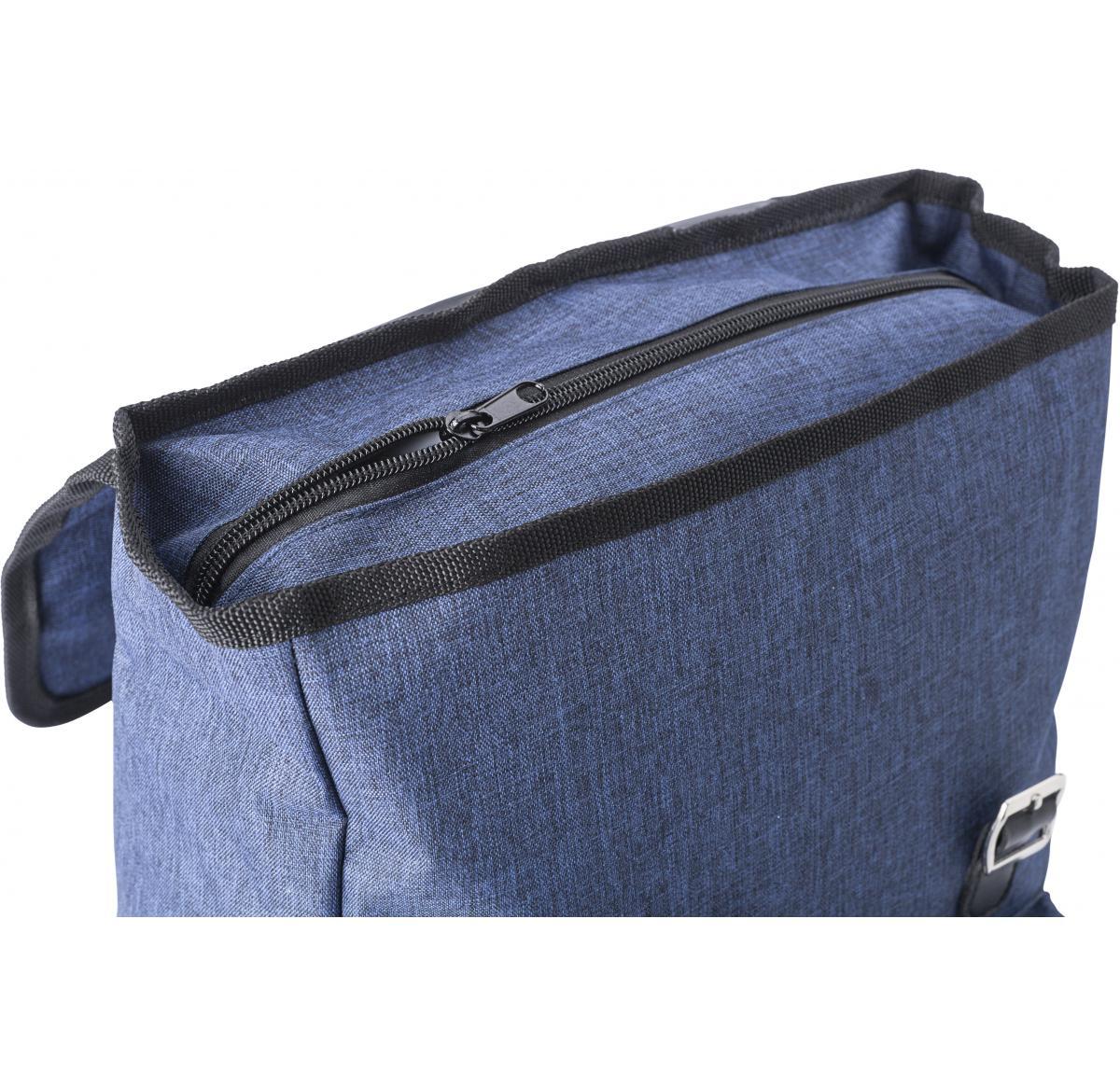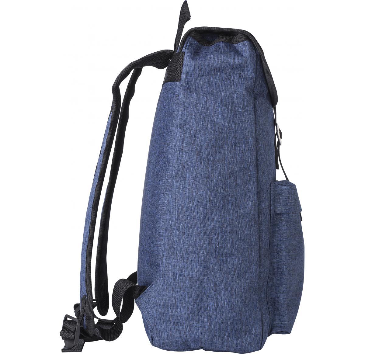 Polyester, two-tone (300D + 210D) backpack, with main compartment and front pocket. The flap closes with two metal buckles. The back is padded. The shoulder straps are padded and adjustable.