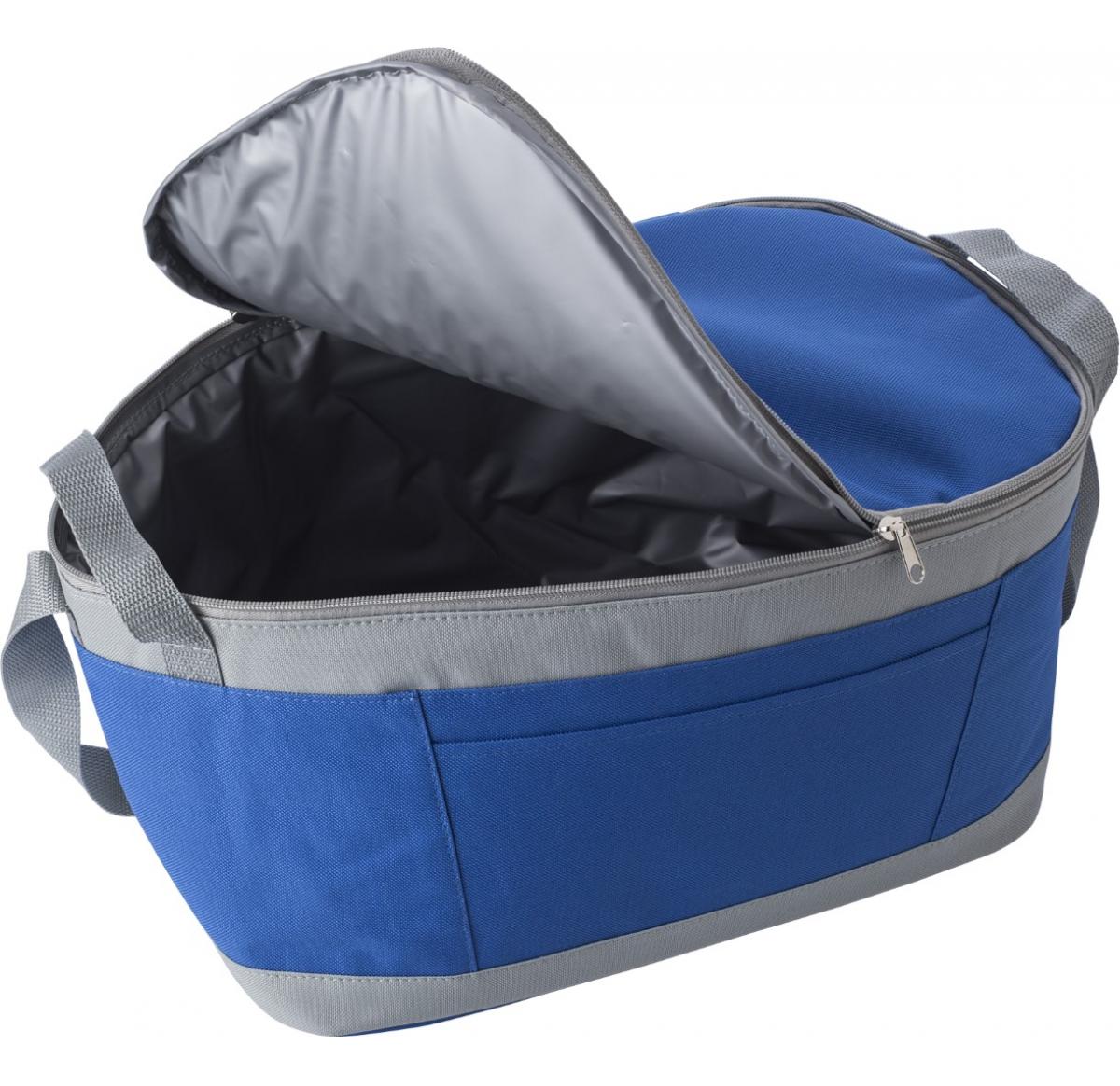 Polyester (600D) cooler bag with PEVA lining on the interior. Open front pocket. The strap is adjustable.