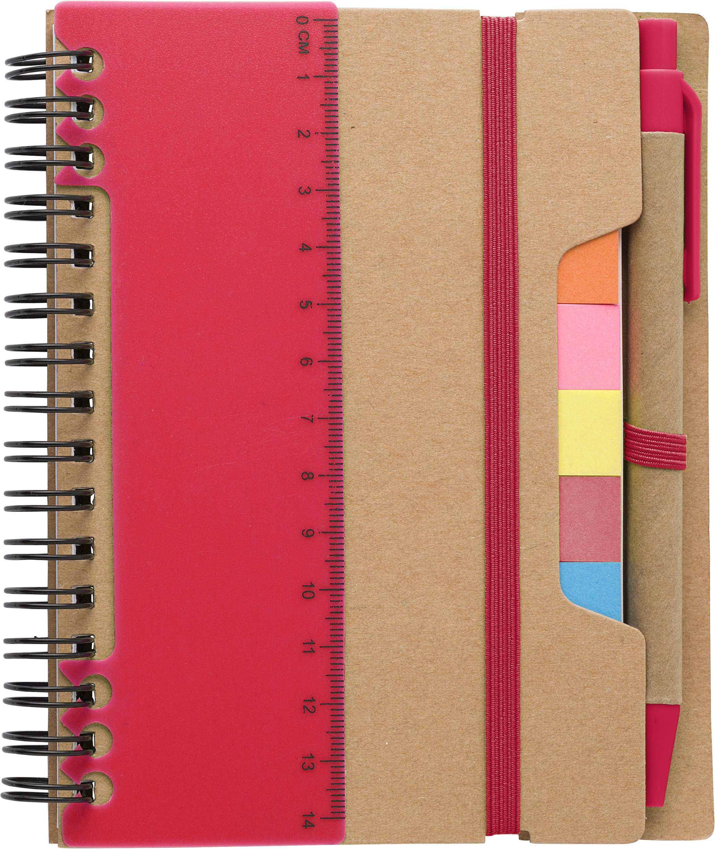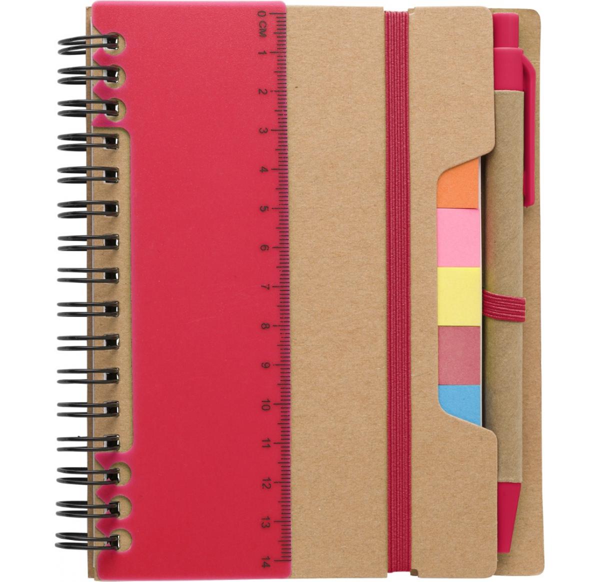 Recycled paper, wire bound notebook with 60 lined pages, five colours of sticky notes, ruler and a ballpen. Blue ink.
