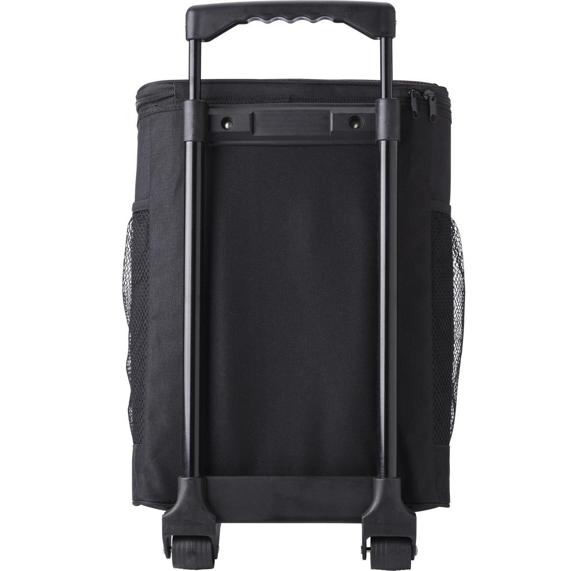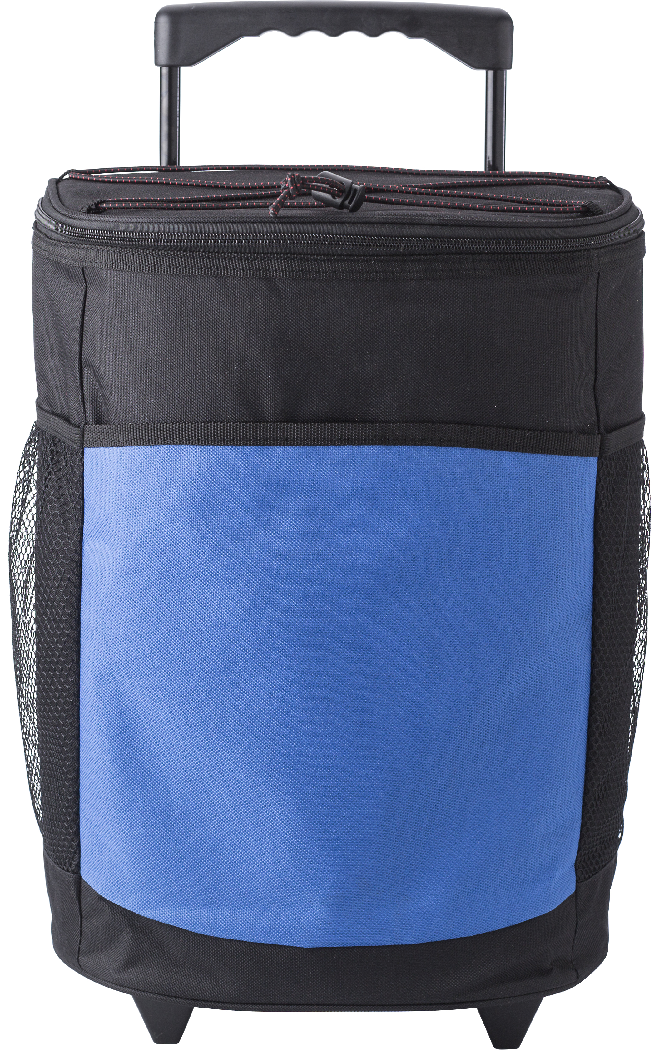 Polyester (600D) cooler trolley bag with extendable handle and two wheels. The trolley has a large main compartment and exterior pockets on the front and the sides.