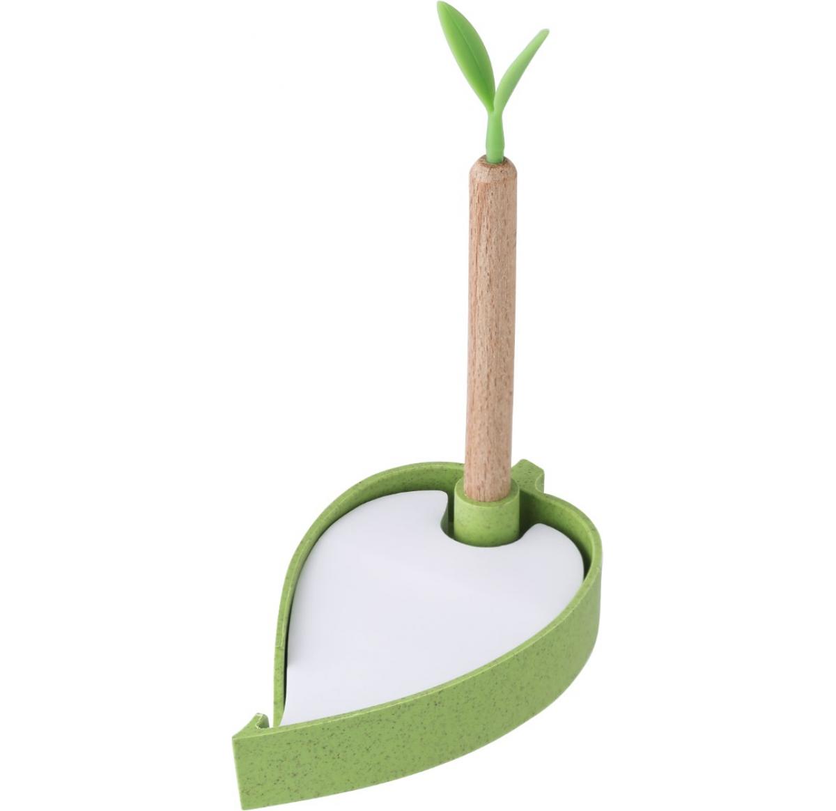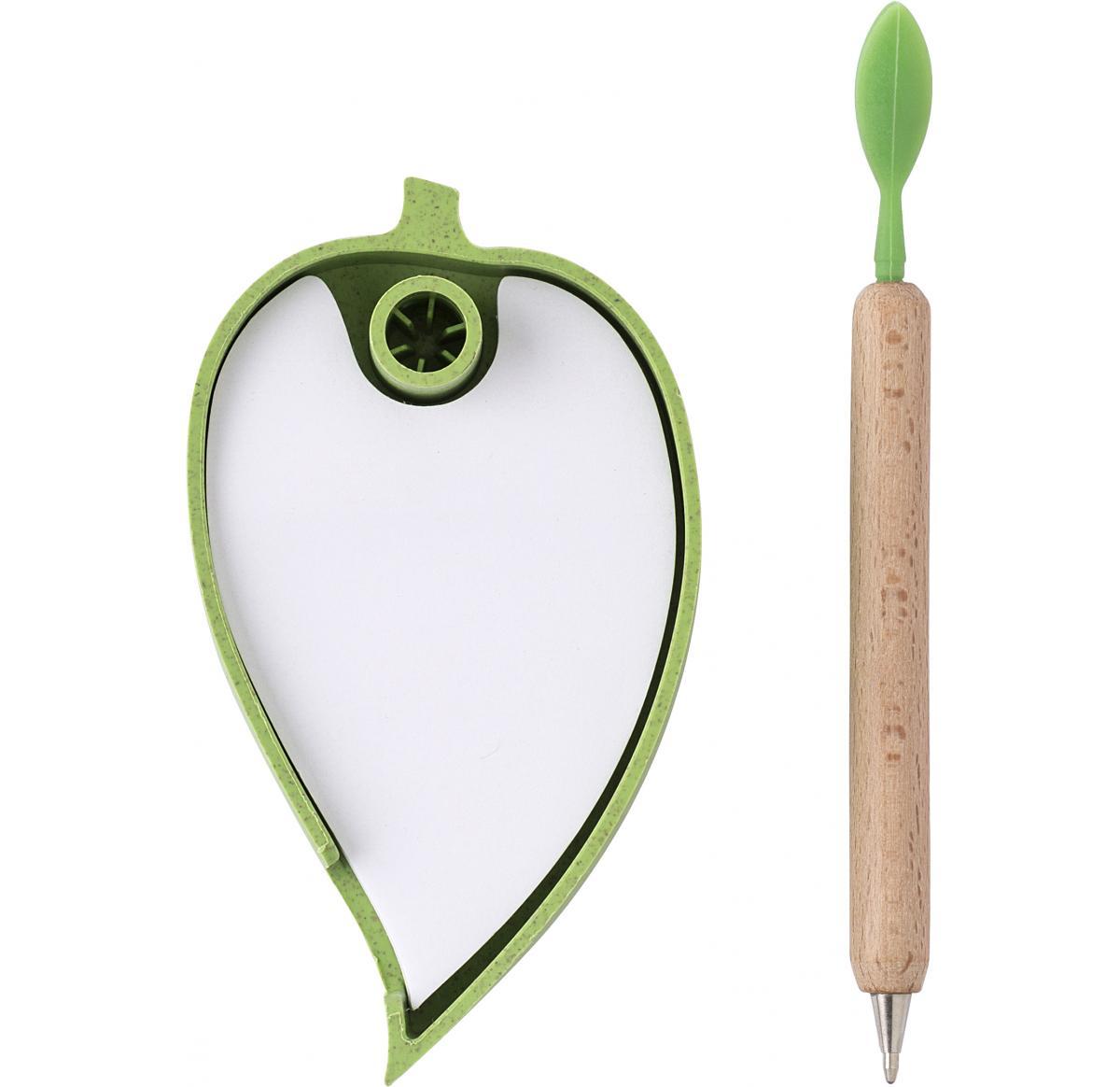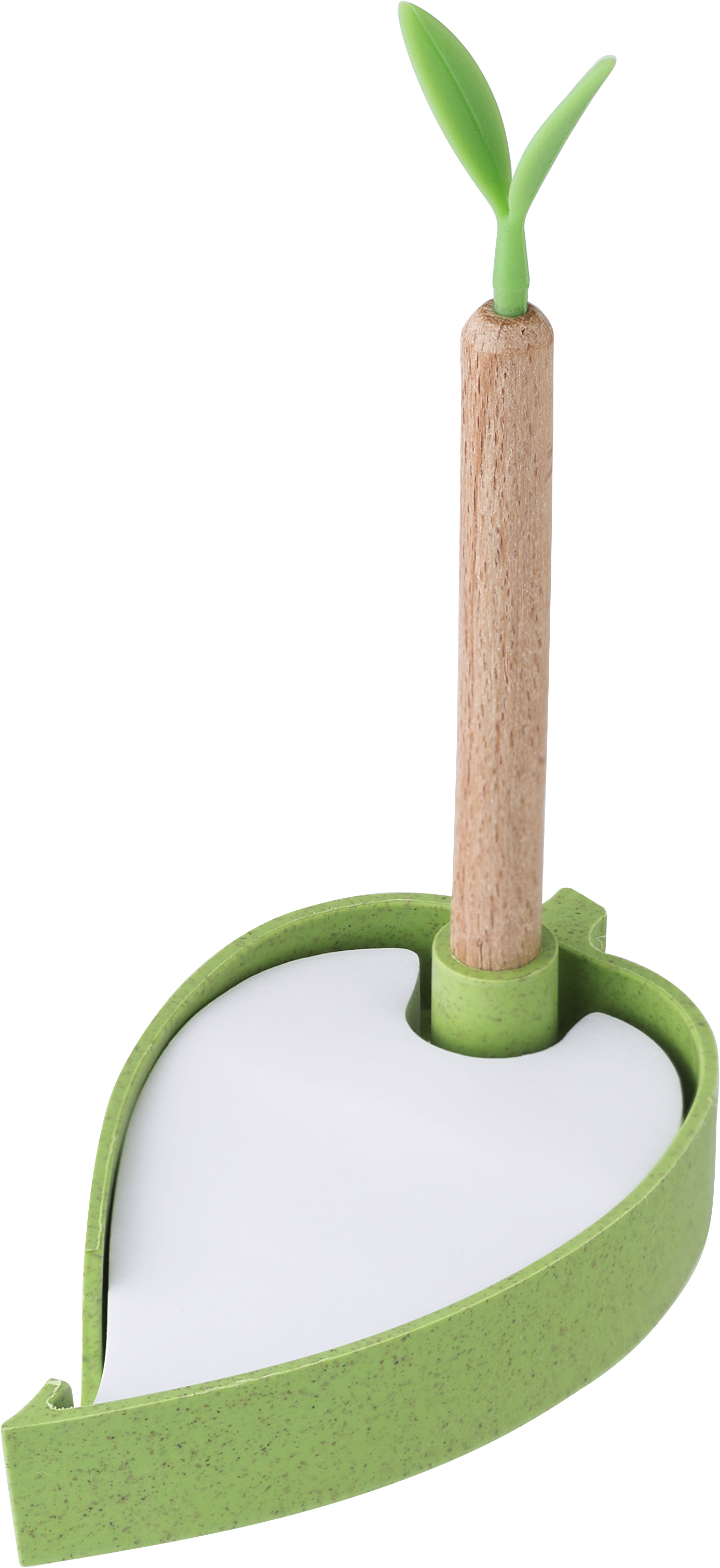 Paper memo block, 100 self-adhesive sheets, with wheat straw holder and wooden ballpen and silicone leaves. Black ink.