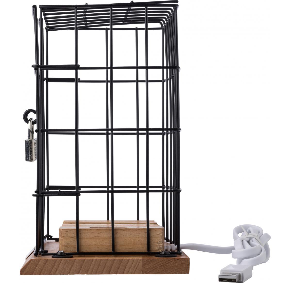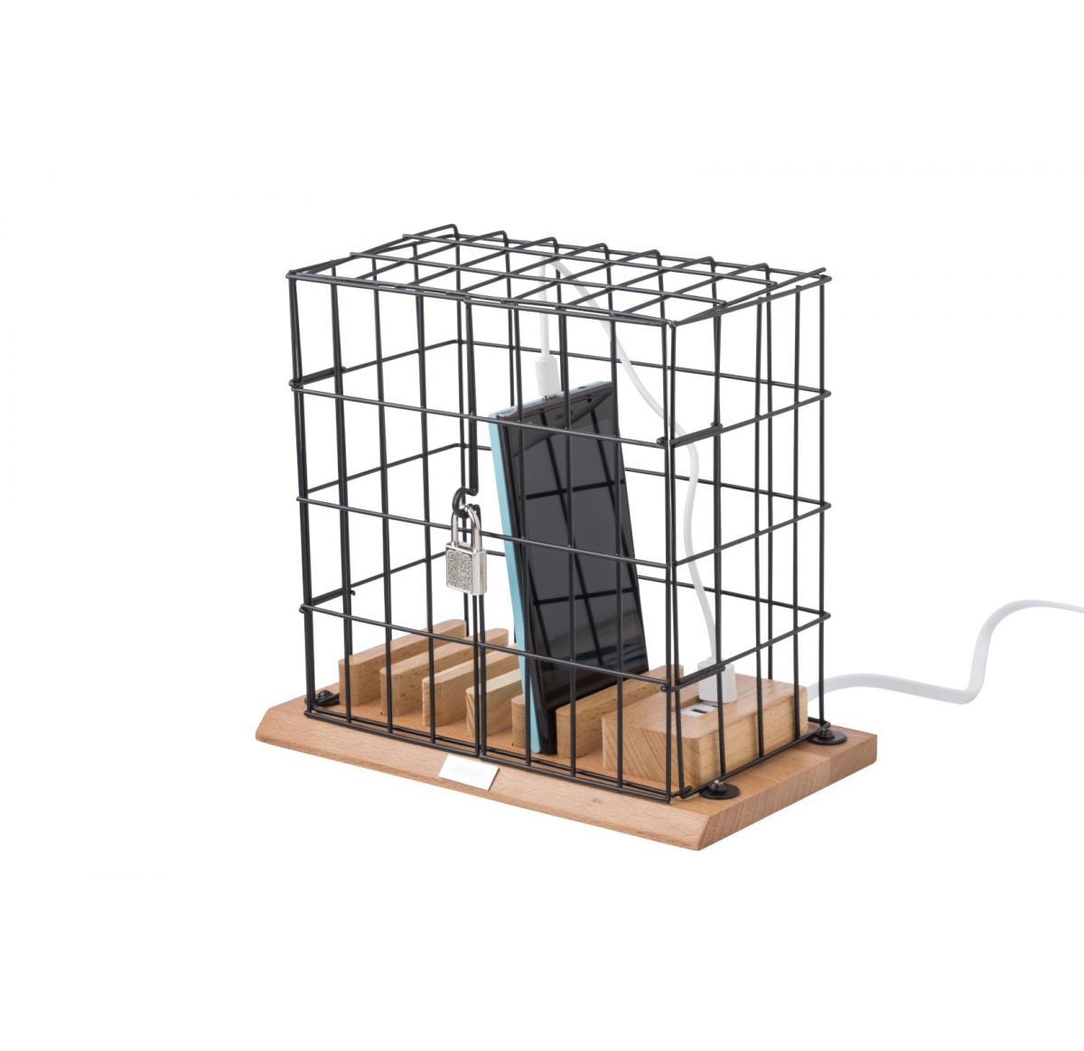Aluminium and wooden phone holder cage, including USB ports and lock with two small keys.