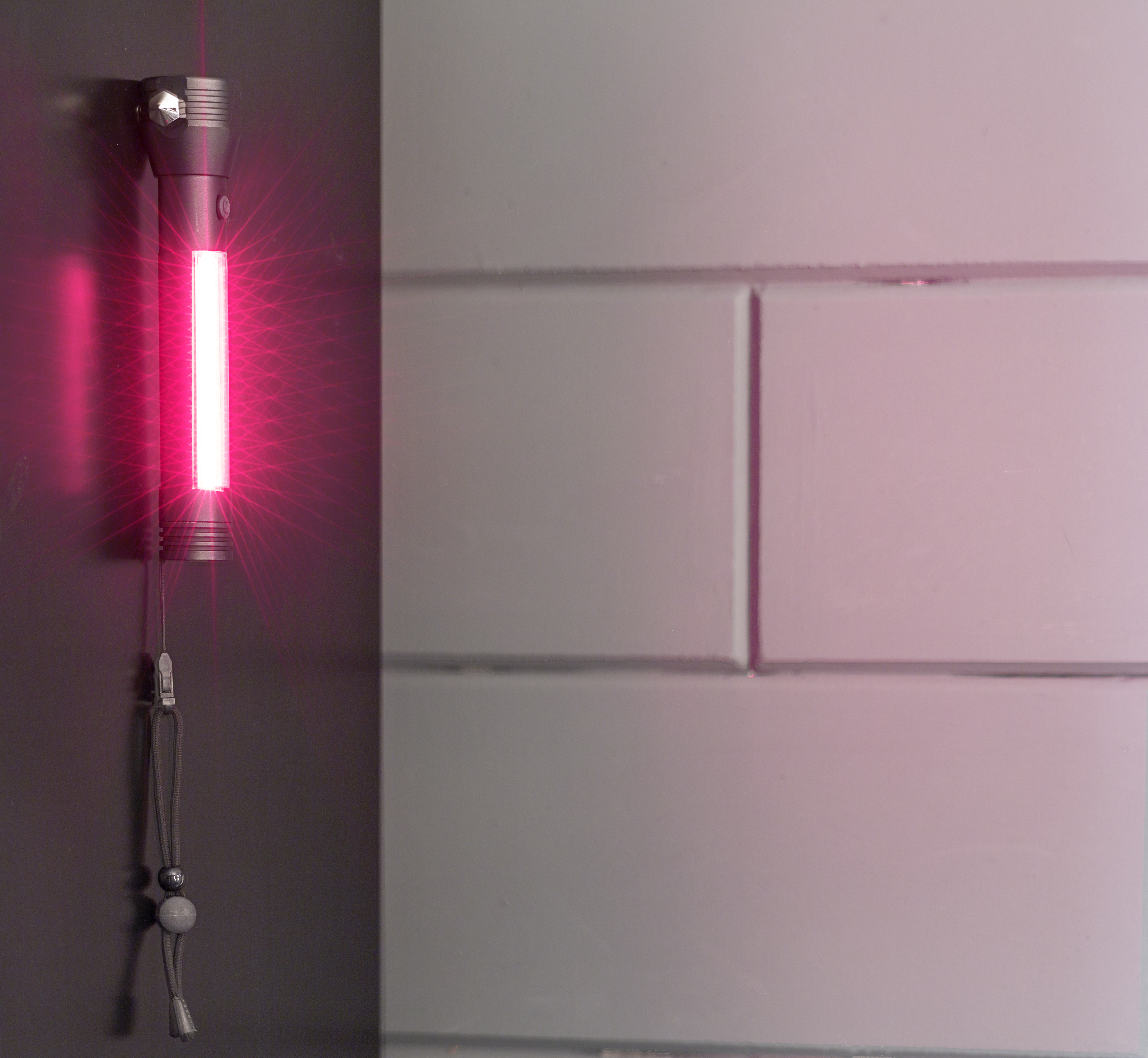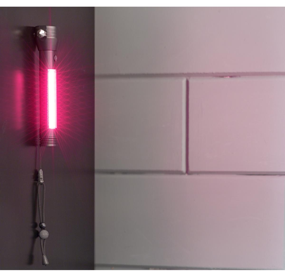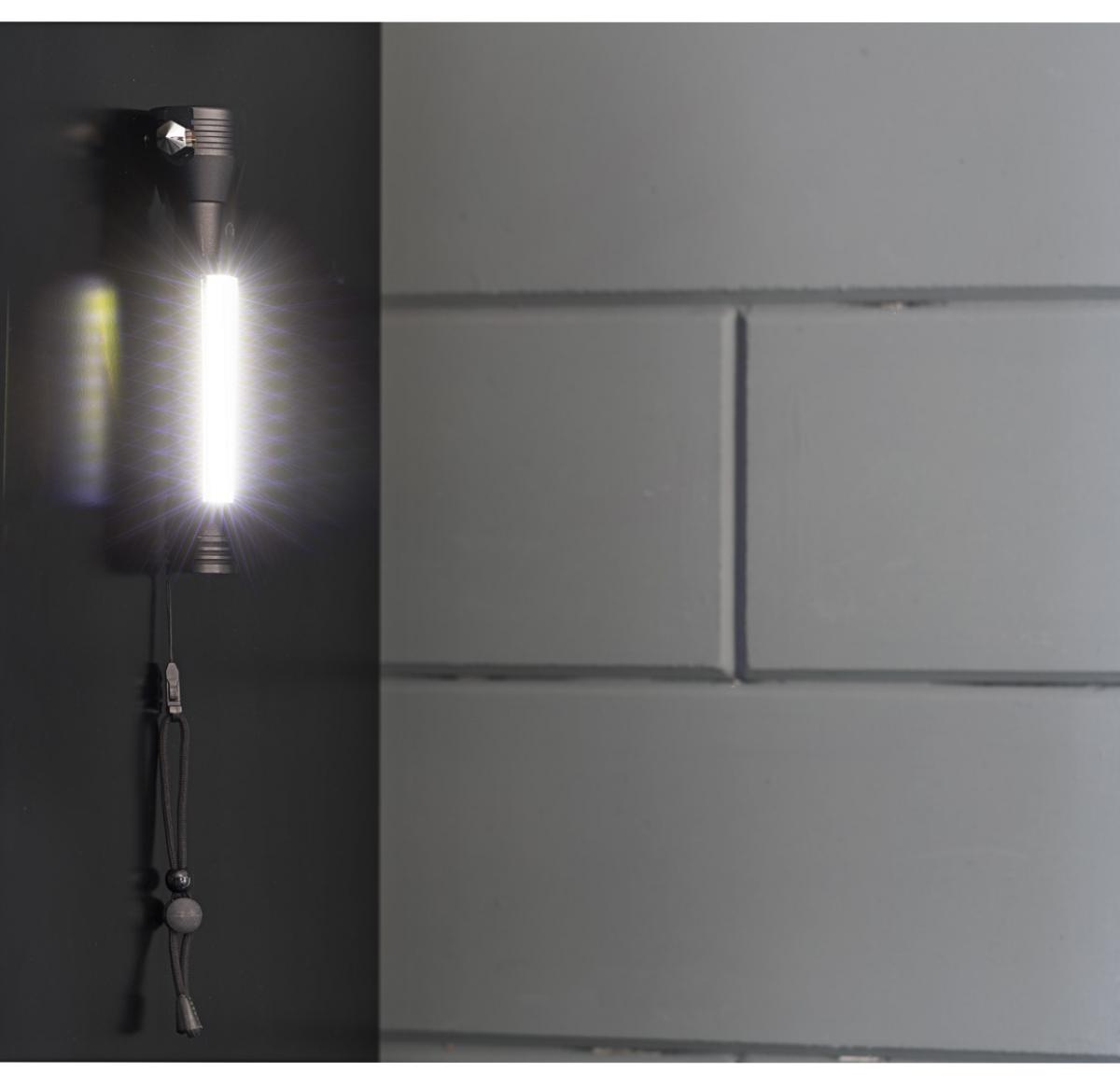 Aluminium, multifunctional COB work light with magnet, seatbelt cutter, safety hammer and wristband.