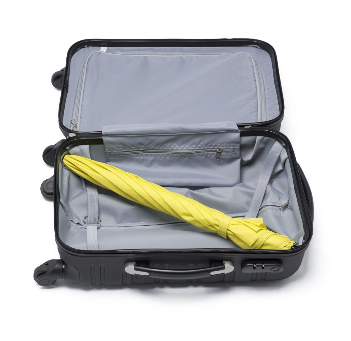 Pongee (190T) manual umbrella with eight panels. Metal shaft, fibreglass ribs and foam handle. Lightweight, short, and especially suitable for hiking.
