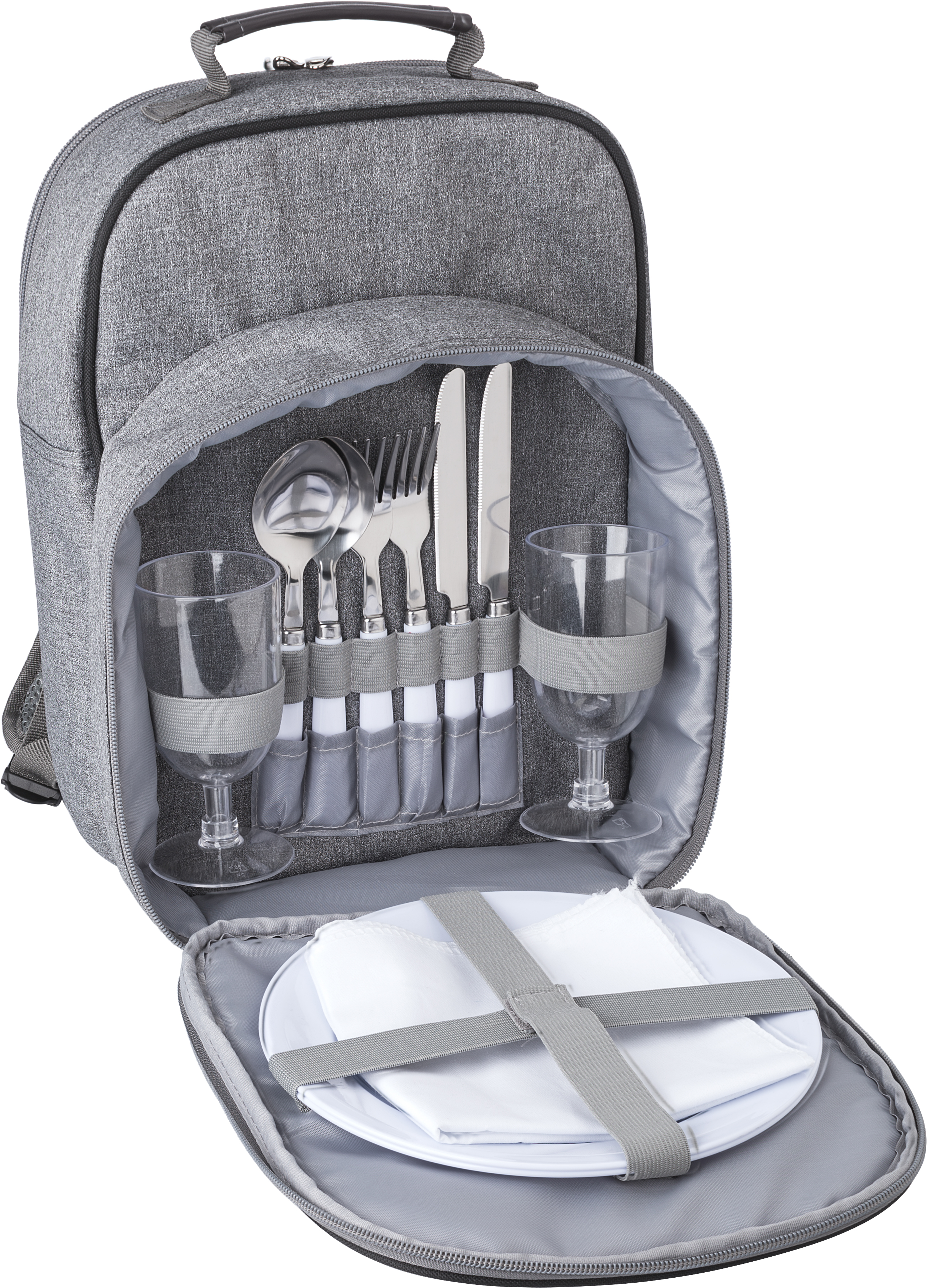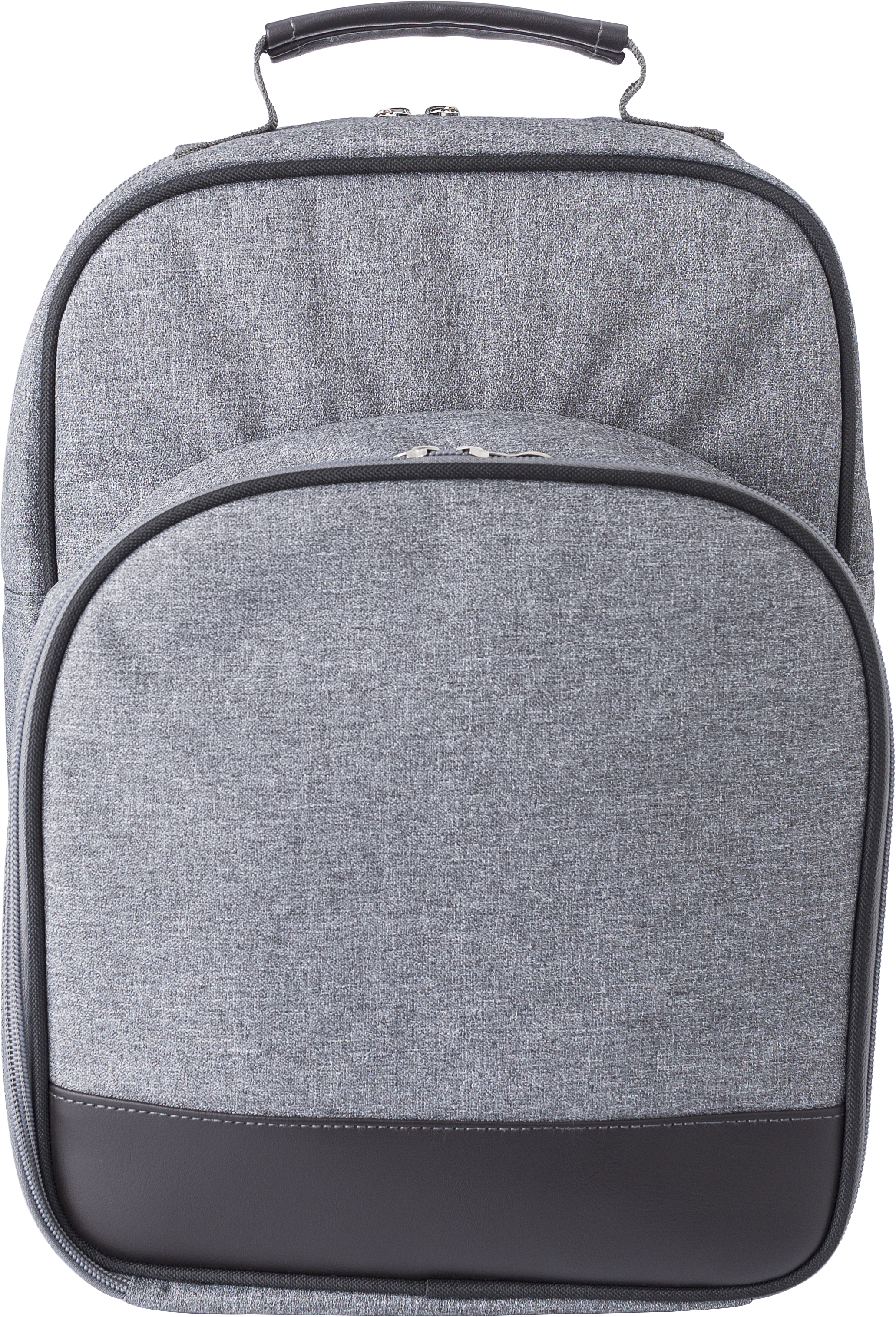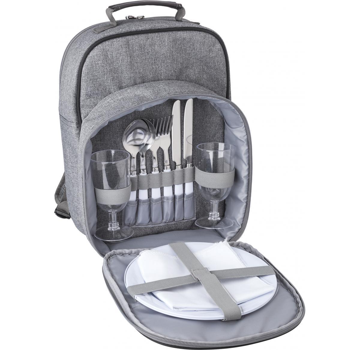 Polycanvas (600D) picnic cooler backpack with aluminium foil lining. One main compartment and one front pocket with cutlery and plates. Adjustable shoulder straps.