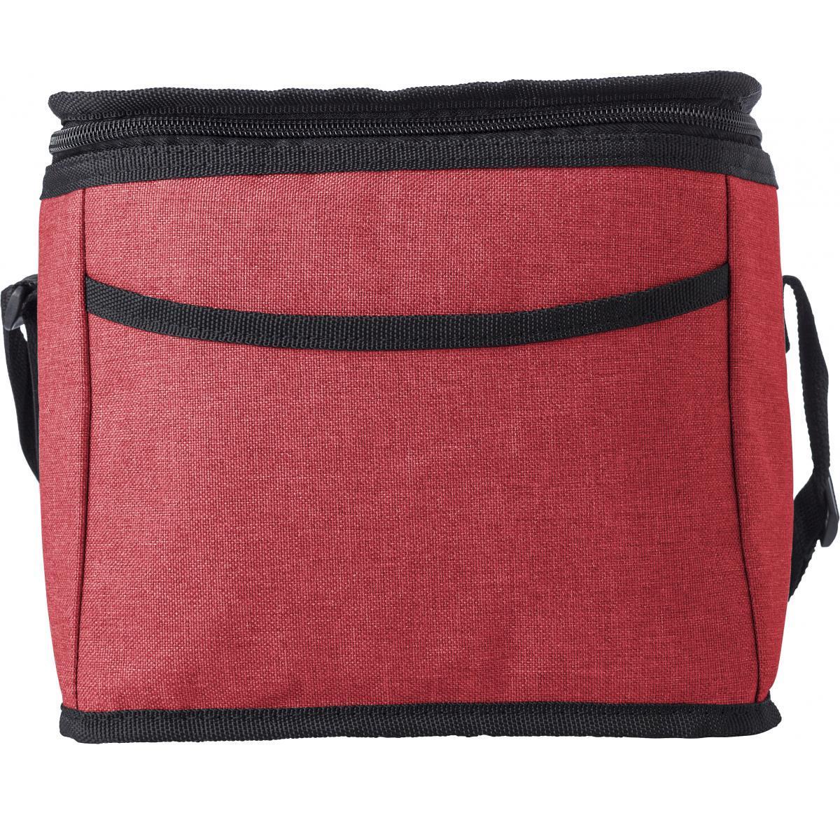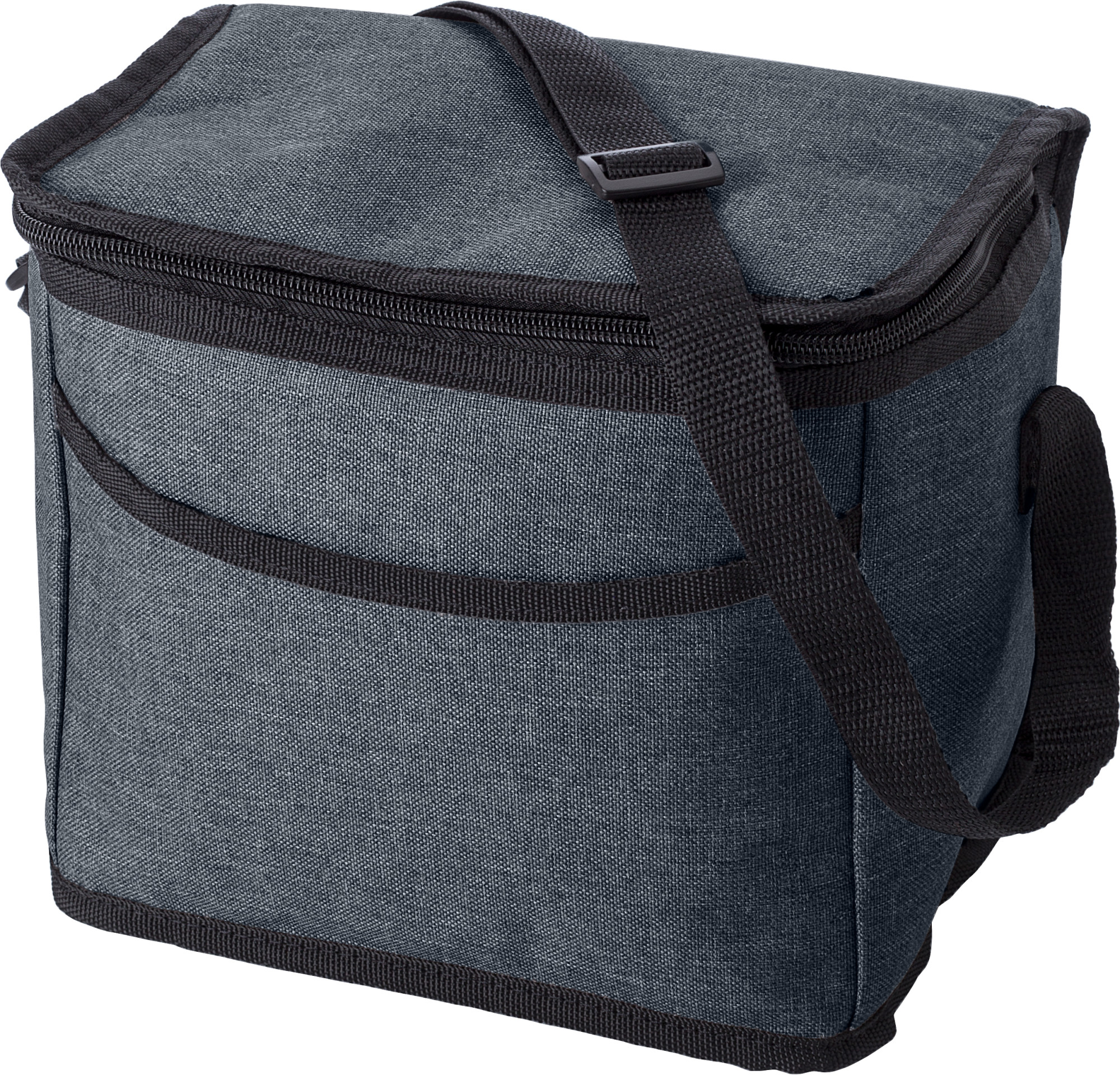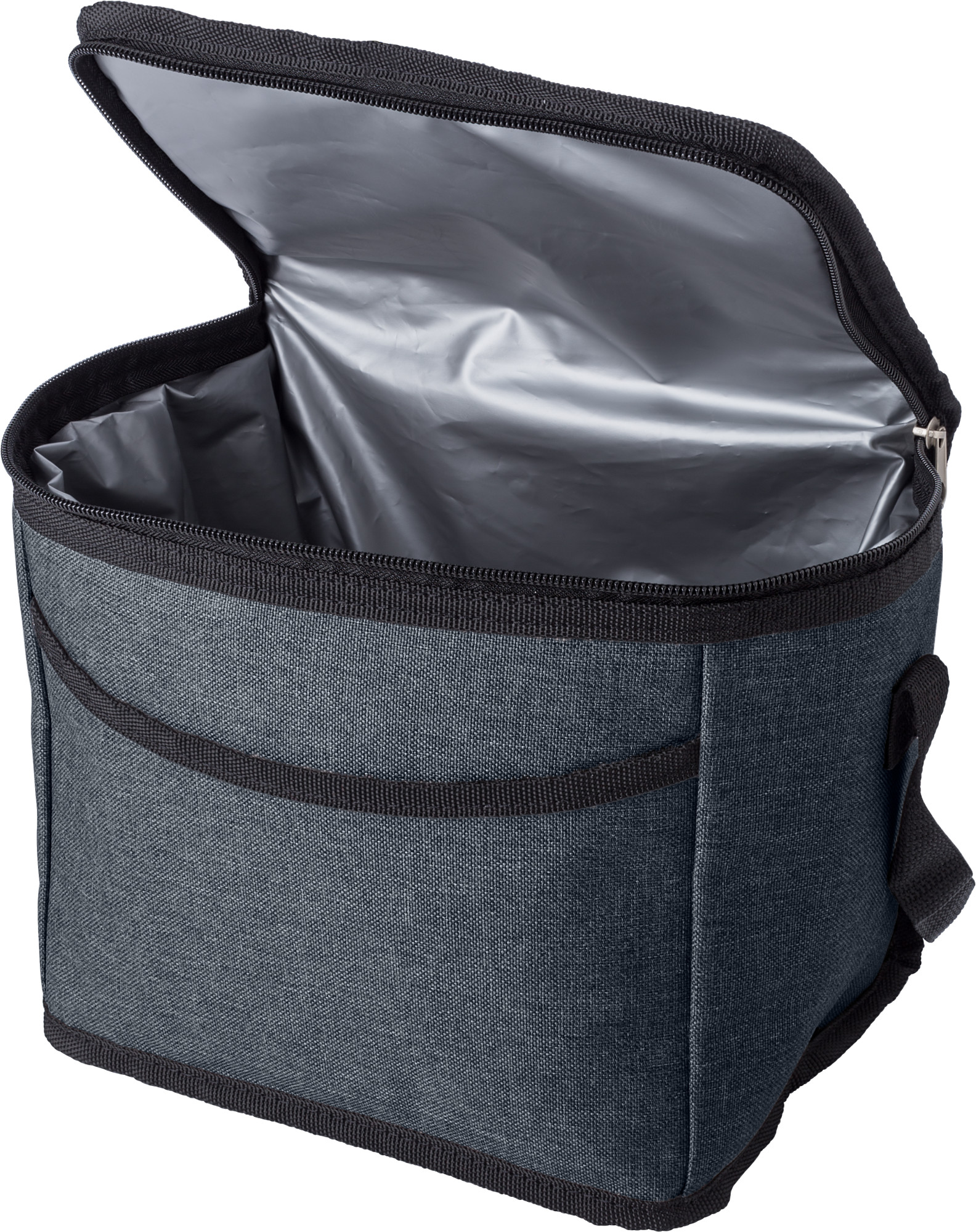 Polycanvas (600D) cooler bag with PEVA interior lining. One main compartment that fits six soda cans, and adjustable strap.