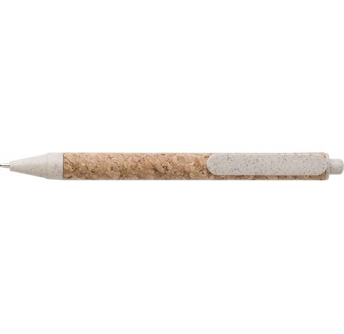 Cork and linen notebook and cork and wheat straw ballpen in kraft paper box. The notebook had an elastic pen loop and 80 sheets of lined paper with date notification. The ballpen has blue ink.