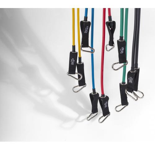 Fitness set in a polyester (210D) bag. Includes five latex fitness elastics. each with a different resistance. Use the carabiners on the nylon (600D) straps to attach handles or attachments.