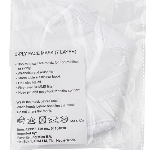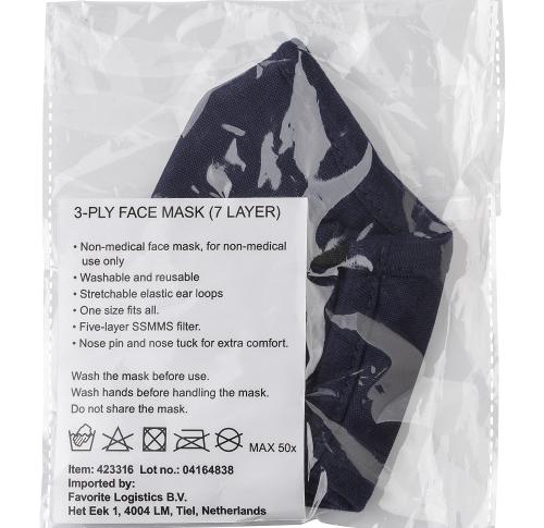 Cotton reusable face mask with elastic straps. The seven-layer mask (Five-layer filter with Melt Blown SSMMS filter) has a bacterial filtration of 95%. Washable at 60 degrees. Non-medical.
