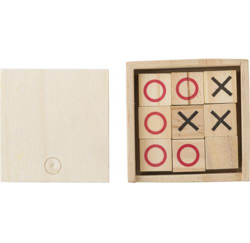 Wooden box with wooden Tic Tac Toe game. The inside of the lid has a game field printed on it to play on.