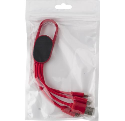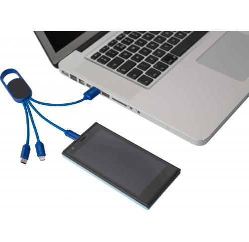 4-in-1 Charging cable set with a hook. The set has a USB, USB-C, micro USB, and Lightning plug. After laser engraving, the logo lights up when the cable is in use.