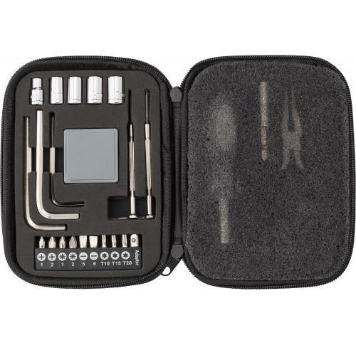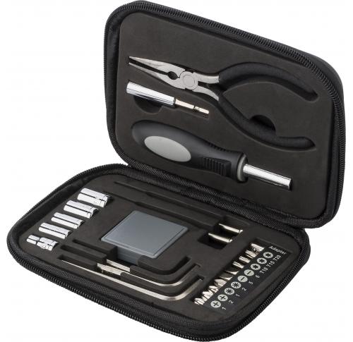 Leather case with tool kit, closes with a zipper/ The kit includes: 5 sockets, 3 hexagonal screwdrivers, 9 screw bits, 1 socket, 1 measure tape, 2 precision screwdrivers, 1 screwdriver handle, 1 extension bar, 1 set of pliers.